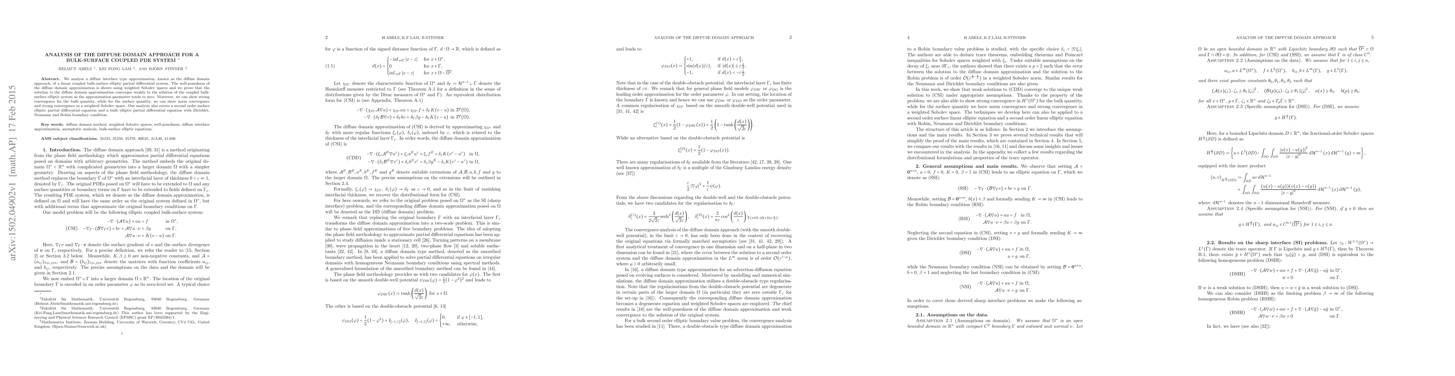 We analyse a diffuse interface type approximation, known as the diffuse domain approach, of a linear coupled bulk-surface elliptic partial differential system. The well-posedness of the diffuse domain approximation is shown using weighted Sobolev spaces and we prove that the solution to the diffuse domain approximation converges weakly to the solution of the coupled bulk-surface elliptic system as the approximation parameter tends to zero. Moreover, we can show strong convergence for the bulk quantity, while for the surface quantity, we can show norm convergence and strong convergence in a weighted Sobolev space. Our analysis also covers a second order surface elliptic partial differential equation and a bulk elliptic partial differential equation with Dirichlet, Neumann and Robin boundary condition.