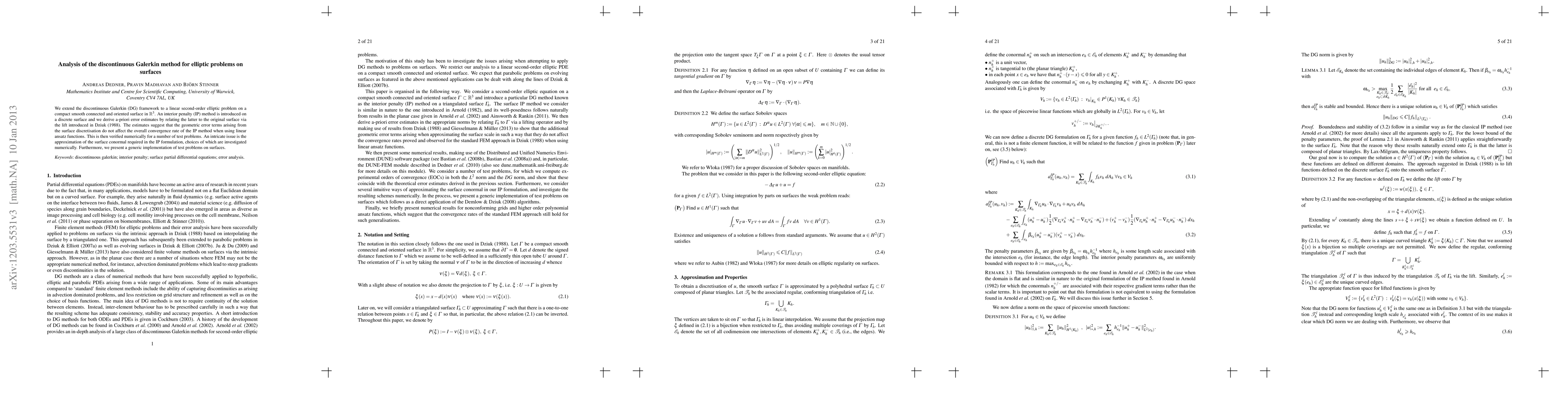 This paper extends the discontinuous Galerkin method to elliptic problems on smooth surfaces, introducing an interior penalty approach and deriving a-priori error estimates. The study shows that geometric errors from surface discretization do not impact convergence rates with linear functions, and numerical tests validate these findings.