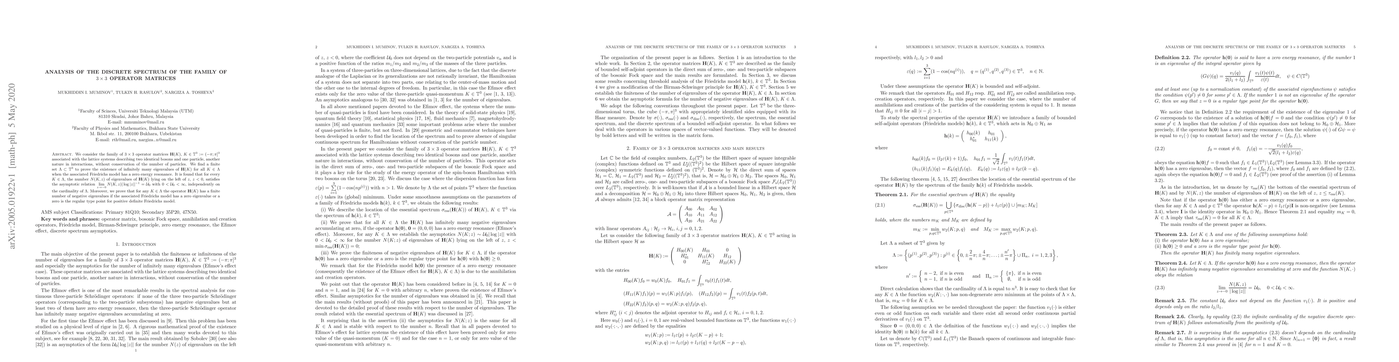 We consider the family of $3 \times 3$ operator matrices ${\bf H}(K),$ $K \in {\Bbb T}^3:=(-\pi; \pi]^3$ associated with the lattice systems describing two identical bosons and one particle, another nature in interactions, without conservation of the number of particles. We find a finite set $\Lambda \subset {\Bbb T}^3$ to prove the existence of infinitely many eigenvalues of ${\bf H}(K)$ for all $K \in \Lambda$ when the associated Friedrichs model has a zero energy resonance. It is found that for every $K \in \Lambda,$ the number $N(K, z)$ of eigenvalues of ${\bf H}(K)$ lying on the left of $z,$ $z<0,$ satisfies the asymptotic relation $\lim\limits_{z \to -0} N(K, z) |\log|z||^{-1}={\mathcal U}_0$ with $0<{\mathcal U}_0<\infty,$ independently on the cardinality of $\Lambda.$ Moreover, we prove that for any $K \in \Lambda$ the operator ${\bf H}(K)$ has a finite number of negative eigenvalues if the associated Friedrichs model has a zero eigenvalue or a zero is the regular type point for positive definite Friedrichs model.