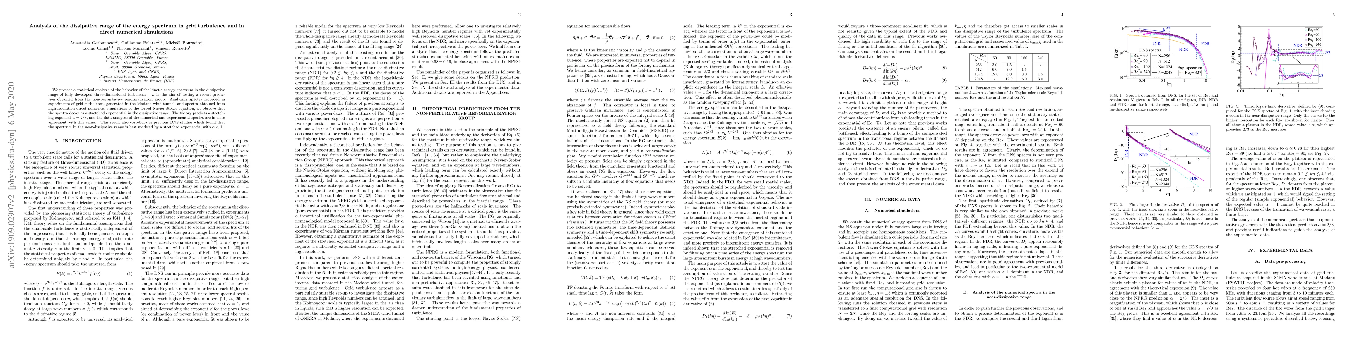 This paper statistically analyzes the kinetic energy spectrum in the dissipative range of grid turbulence, comparing experimental data from Modane wind tunnel and high-resolution DNS. It finds that the spectrum follows a stretched exponential with an exponent $\alpha = 0.68 \pm 0.19$, aligning closely with the theoretical prediction $\alpha=2/3$ from non-perturbative renormalisation group theory.
