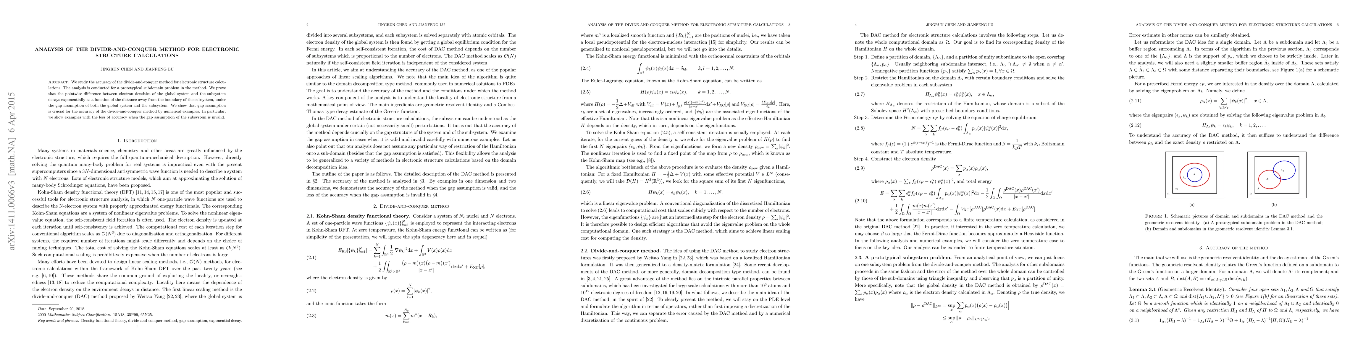 This paper analyzes the accuracy of the divide-and-conquer method for electronic structure calculations, proving that electron density differences decay exponentially with distance from subsystem boundaries under gap assumptions. It highlights the critical role of these assumptions for method accuracy, demonstrating loss of precision when they are not met.