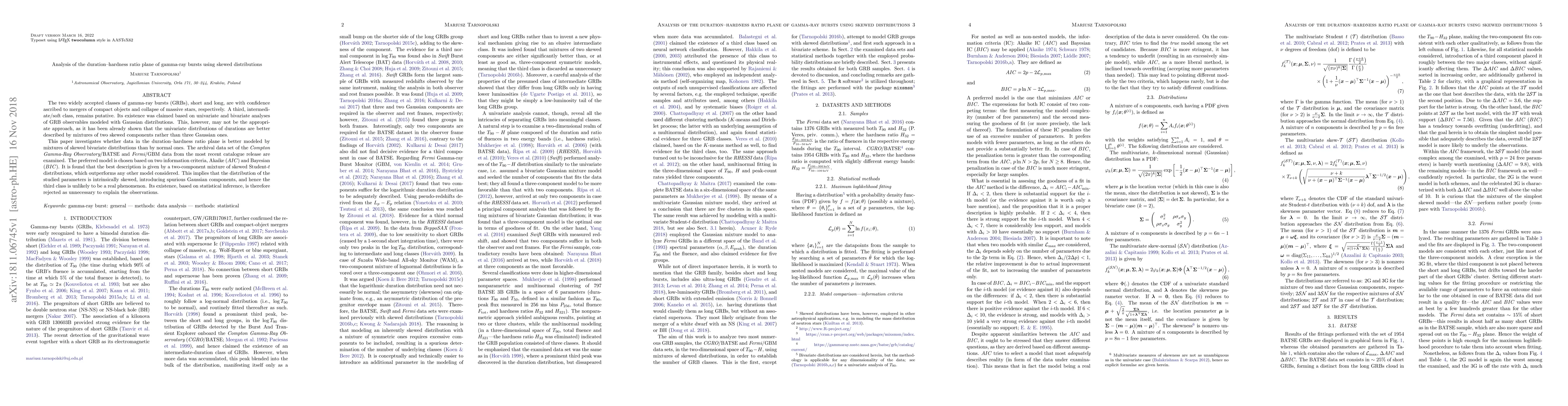 This paper investigates the duration-hardness ratio plane of gamma-ray bursts using skewed distributions, finding that a two-component mixture of skewed Student-$t$ distributions better models the data than Gaussian models. The results suggest that the third, intermediate/soft class of GRBs is likely a statistical artifact rather than a real phenomenon.