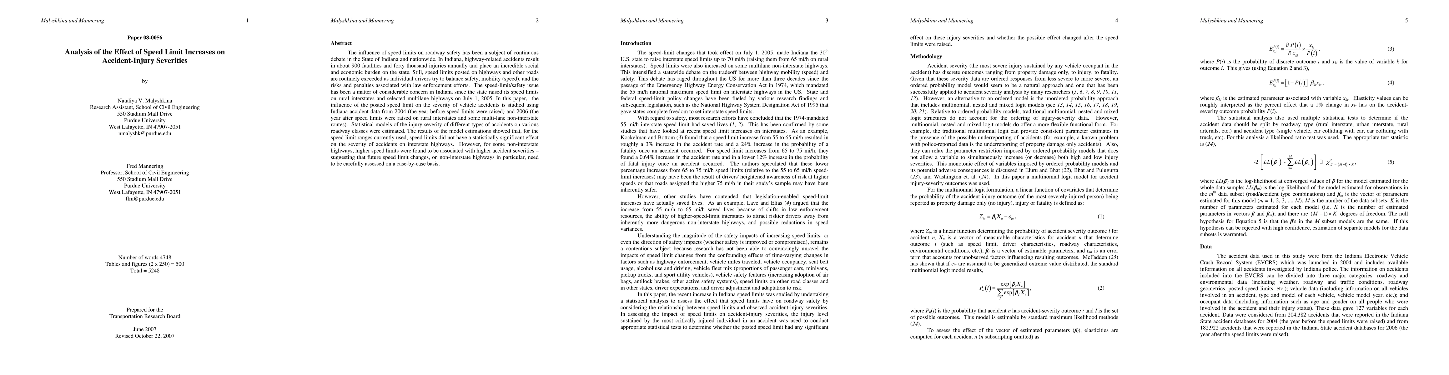 The influence of speed limits on roadway safety has been a subject of continuous debate in the State of Indiana and nationwide. In Indiana, highway-related accidents result in about 900 fatalities and forty thousand injuries annually and place an incredible social and economic burden on the state. Still, speed limits posted on highways and other roads are routinely exceeded as individual drivers try to balance safety, mobility (speed), and the risks and penalties associated with law enforcement efforts. The speed-limit/safety issue has been a matter of considerable concern in Indiana since the state raised its speed limits on rural interstates and selected multilane highways on July 1, 2005. In this paper, the influence of the posted speed limit on the severity of vehicle accidents is studied using Indiana accident data from 2004 (the year before speed limits were raised) and 2006 (the year after speed limits were raised on rural interstates and some multi-lane non-interstate routes). Statistical models of the injury severity of different types of accidents on various roadway classes were estimated. The results of the model estimations showed that, for the speed limit ranges currently used, speed limits did not have a statistically significant effect on the severity of accidents on interstate highways. However, for some non-interstate highways, higher speed limits were found to be associated with higher accident severities - suggesting that future speed limit changes, on non-interstate highways in particular, need to be carefully assessed on a case-by-case basis.