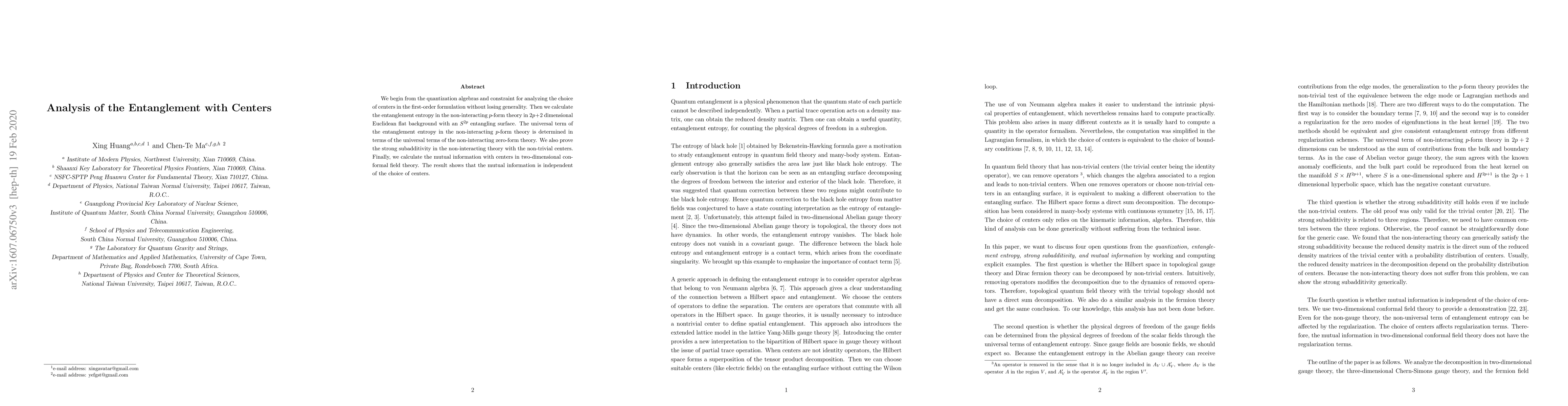 We begin from the quantization algebras and constraint for analyzing the choice of centers in the first-order formulation without losing generality. Then we calculate the entanglement entropy in the non-interacting $p$-form theory in $2p+2$ dimensional Euclidean flat background with an $S^{2p}$ entangling surface. The universal term of the entanglement entropy in the non-interacting $p$-form theory is determined in terms of the universal terms of the non-interacting zero-form theory. We also prove the strong subadditivity in the non-interacting theory with the non-trivial centers. Finally, we calculate the mutual information with centers in two-dimensional conformal field theory. The result shows that the mutual information is independent of the choice of centers.