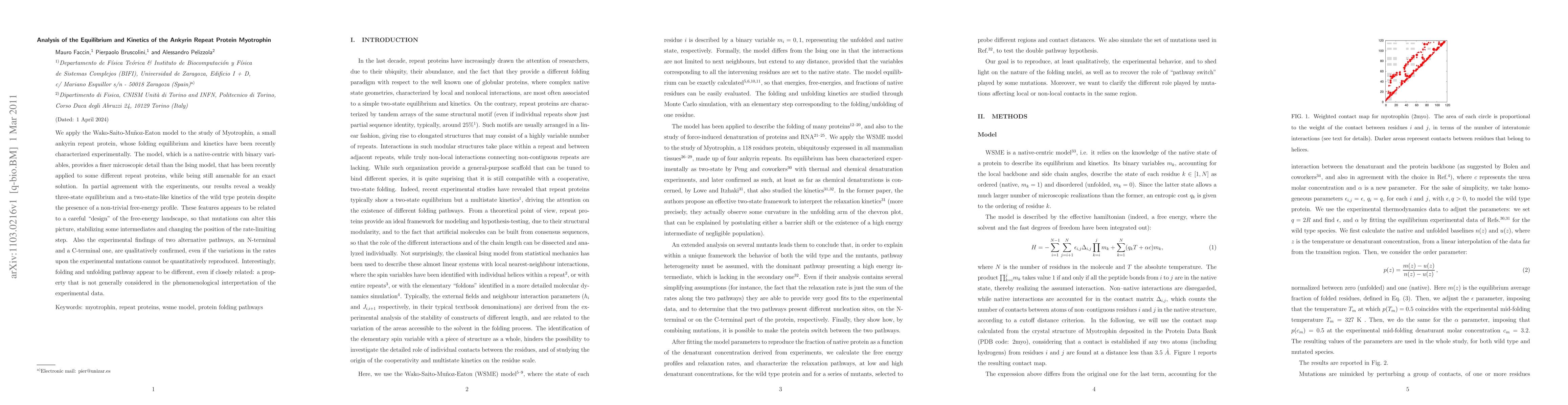 We apply the Wako-Saito-Munoz-Eaton model to the study of Myotrophin, a small ankyrin repeat protein, whose folding equilibrium and kinetics have been recently characterized experimentally. The model, which is a native-centric with binary variables, provides a finer microscopic detail than the Ising model, that has been recently applied to some different repeat proteins, while being still amenable for an exact solution. In partial agreement with the experiments, our results reveal a weakly three-state equilibrium and a two-state-like kinetics of the wild type protein despite the presence of a non-trivial free-energy profile. These features appear to be related to a careful "design" of the free-energy landscape, so that mutations can alter this picture, stabilizing some intermediates and changing the position of the rate-limiting step. Also the experimental findings of two alternative pathways, an N-terminal and a C-terminal one, are qualitatively confirmed, even if the variations in the rates upon the experimental mutations cannot be quantitatively reproduced. Interestingly, folding and unfolding pathway appear to be different, even if closely related: a property that is not generally considered in the phenomenological interpretation of the experimental data.