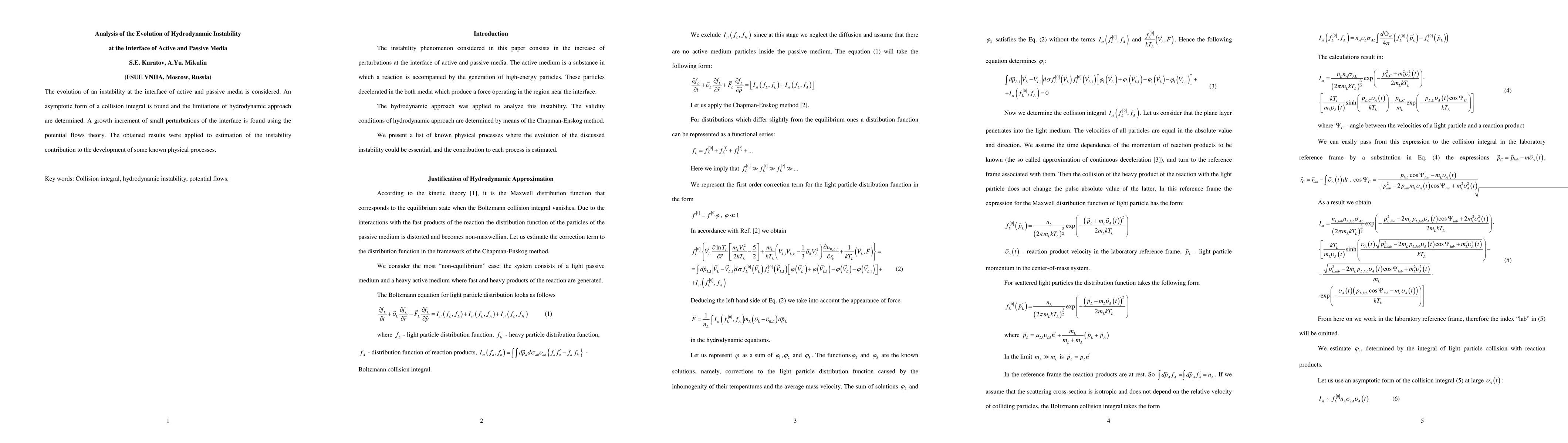 The evolution of an instability at the interface of active and passive media is considered. An asymptotic form of a collision integral is found and the limitations of hydrodynamic approach are determined. A growth increment of small perturbations of the interface is found using the potential flows theory. The obtained results were applied to estimation of the instability contribution to the development of some known physical processes.