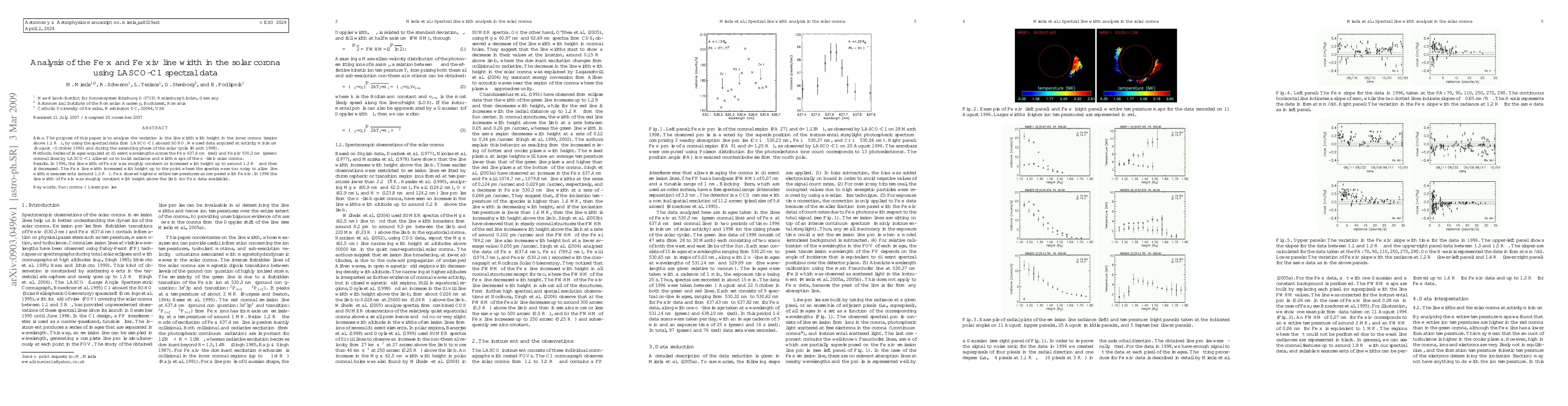 This study analyzes Fe X and Fe XIV line widths in the solar corona using LASCO-C1 spectral data from SOHO. In 1996, Fe XIV width was constant or increased up to 1.3 Rsun, then decreased; Fe X width increased up to noise levels at 1.3 Rsun. Fe X had higher temperatures than Fe XIV. In 1998, Fe XIV width remained constant above the limb, with no Fe X data available.