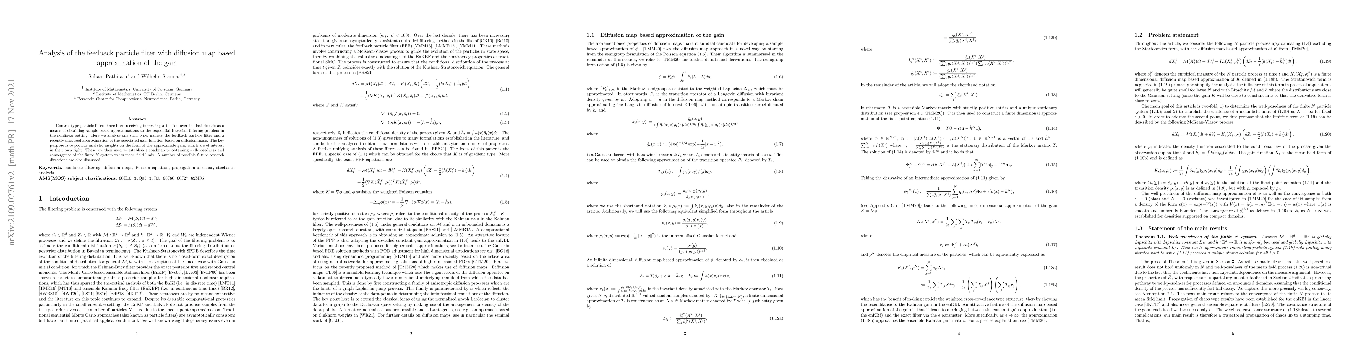 This paper analyzes the Feedback Particle Filter, focusing on its gain approximation using diffusion maps. It offers analytical insights into the approximate gain form, aiming to establish well-posedness and convergence of the finite N system to its mean field limit. Future research directions are also proposed.