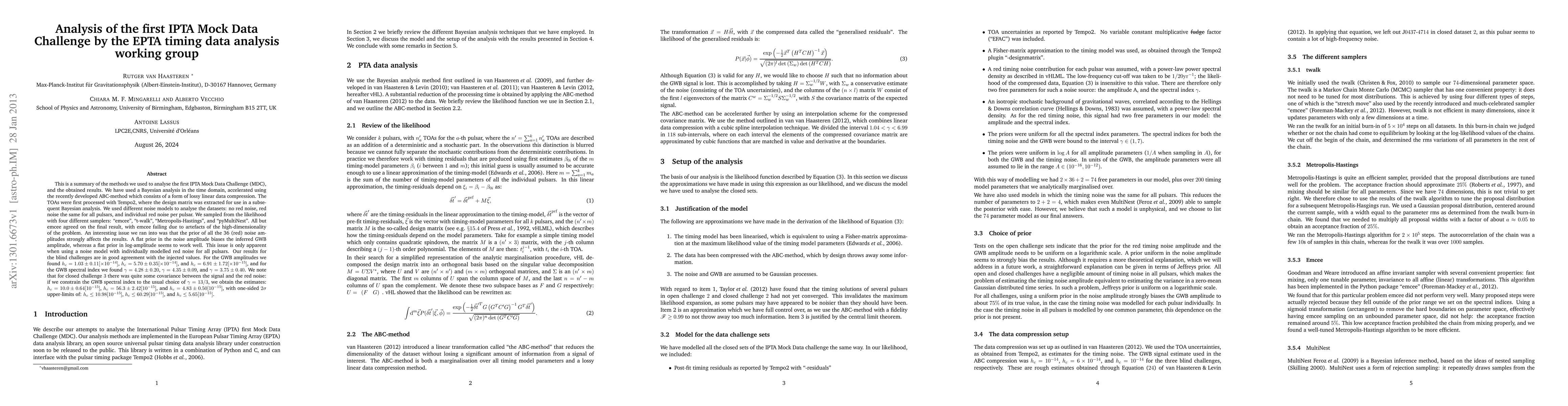 This is a summary of the methods we used to analyse the first IPTA Mock Data Challenge (MDC), and the obtained results. We have used a Bayesian analysis in the time domain, accelerated using the recently developed ABC-method which consists of a form of lossy linear data compression. The TOAs were first processed with Tempo2, where the design matrix was extracted for use in a subsequent Bayesian analysis. We used different noise models to analyse the datasets: no red noise, red noise the same for all pulsars, and individual red noise per pulsar. We sampled from the likelihood with four different samplers: "emcee", "t-walk", "Metropolis-Hastings", and "pyMultiNest". All but emcee agreed on the final result, with emcee failing due to artefacts of the high-dimensionality of the problem. An interesting issue we ran into was that the prior of all the 36 (red) noise amplitudes strongly affects the results. A flat prior in the noise amplitude biases the inferred GWB amplitude, whereas a flat prior in log-amplitude seems to work well. This issue is only apparent when using a noise model with individually modelled red noise for all pulsars. Our results for the blind challenges are in good agreement with the injected values. For the GWB amplitudes we found h_c = 1.03 +/- 0.11 [10^{-14}], h_c = 5.70 +/- 0.35 [10^{-14}], and h_c = 6.91 +/- 1.72 [10^{-15}], and for the GWB spectral index we found gamma = 4.28 +/- 0.20, gamma = 4.35 +/- 0.09, and gamma = 3.75 +/- 0.40. We note that for closed challenge 3 there was quite some covariance between the signal and the red noise: if we constrain the GWB spectral index to the usual choice of gamma = 13/3, we obtain the estimates: h_c = 10.0 +/- 0.64 [10^{-15}], h_c = 56.3 +/- 2.42 [10^{-15}], and h_c = 4.83 +/- 0.50 [10^{-15}], with one-sided 2 sigma upper-limits of: h_c <= 10.98 [10^{-15}], h_c <= 60.29 [10^{-15}], and h_c <= 5.65 [10^{-15}].