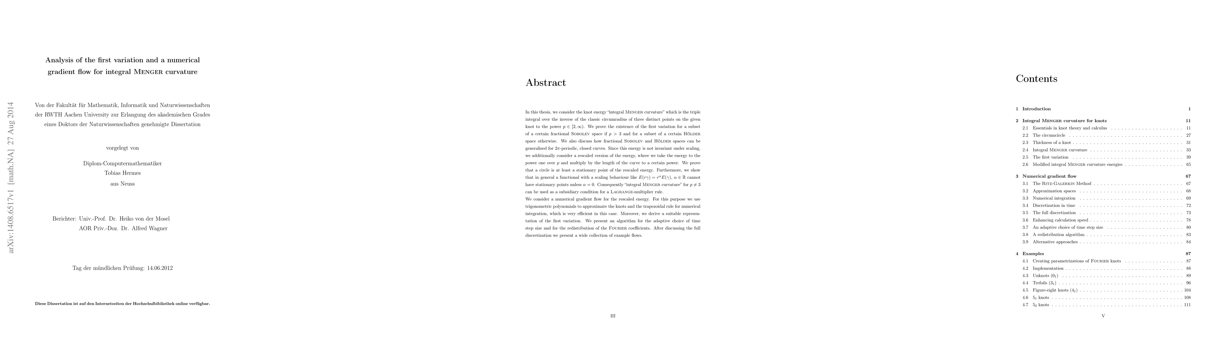 In this thesis, we consider the knot energy "integral Menger curvature" which is the triple integral over the inverse of the classic circumradius of three distinct points on the given knot to the power $p\in [2,\infty)$. We prove the existence of the first variation for a subset of a certain fractional Sobolev space if $p>3$ and for a subset of a certain H\"older space otherwise. We also discuss how fractional Sobolev and H\"older spaces can be generalised for $2\pi$-periodic, closed curves. Since this energy is not invariant under scaling, we additionally consider a rescaled version of the energy, where we take the energy to the power one over $p$ and multiply by the length of the curve to a certain power. We prove that a circle is at least a stationary point of the rescaled energy. Furthermore, we show that in general a functional with a scaling behaviour like $E(r\gamma)=r^\alpha E(\gamma)$, $\alpha\in\mathbb{R}$ cannot have stationary points unless $\alpha=0$. Consequently "integral Menger curvature" for $p\neq 3$ can be used as a subsidiary condition for a Lagrange-multiplier rule. We consider a numerical gradient flow for the rescaled energy. For this purpose we use trigonometric polynomials to approximate the knots and the trapezoidal rule for numerical integration, which is very efficient in this case. Moreover, we derive a suitable representation of the first variation. We present an algorithm for the adaptive choice of time step size and for the redistribution of the Fourier coefficients. After discussing the full discretization we present a wide collection of example flows.