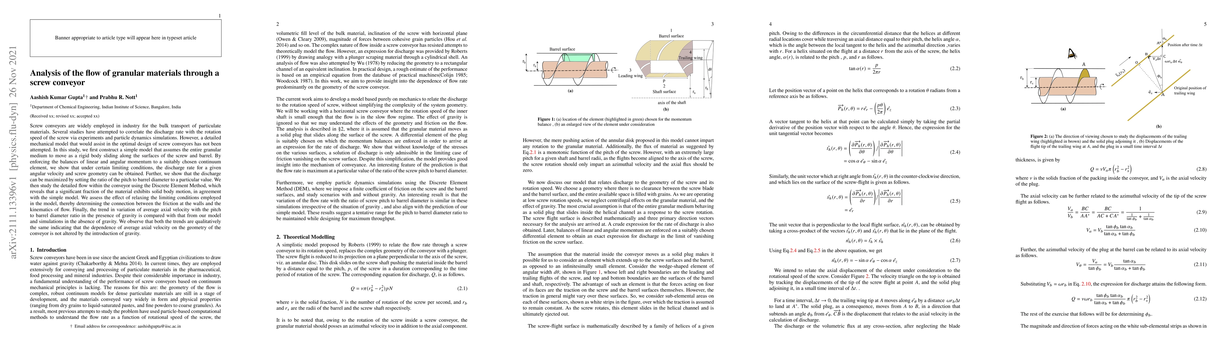 Screw conveyors are widely employed in industry for the bulk transport of particulate materials. Several studies have attempted to correlate the discharge rate with the rotation speed of the screw via experiments and particle dynamics simulations. However, a detailed mechanical model that would assist in the optimal design of screw conveyors has not been attempted. In this study, we first construct a simple model that assumes the entire granular medium to move as a rigid body sliding along the surfaces of the screw and barrel. By enforcing the balances of linear and angular momentum to a suitably chosen continuum element, we show that under certain limiting conditions, the discharge rate for a given angular velocity and screw geometry can be obtained. Further, we show that the discharge can be maximized by setting the ratio of the pitch to barrel diameter to a particular value. We then study the detailed flow within the conveyor using the Discrete Element Method, which reveals that a significant fraction of the material exhibits solid body motion, in agreement with the simple model. We assess the effect of relaxing the limiting conditions employed in the model, thereby determining the connection between the friction at the walls and the kinematics of flow. Finally, the trend in variation of average axial velocity with the pitch to barrel diameter ratio in the presence of gravity is compared with that from our model and simulations in the absence of gravity. We observe that both the trends are qualitatively the same indicating that the dependence of average axial velocity on the geometry of the conveyor is not altered by the introduction of gravity.