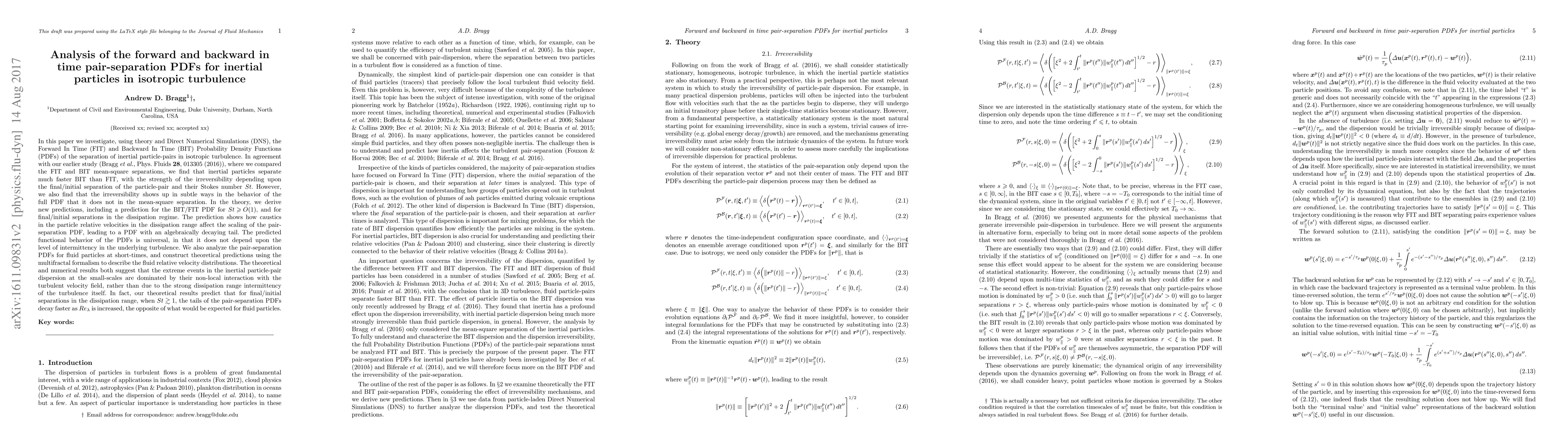 This paper examines the Forward In Time (FIT) and Backward In Time (BIT) Probability Density Functions (PDFs) of inertial particle-pair separation in isotropic turbulence, revealing that particles separate faster in BIT scenarios. The study introduces new theoretical predictions for the BIT/FIT PDFs, especially for larger Stokes numbers and small-scale separations, showing an algebraically decaying tail due to caustics in relative velocities.
