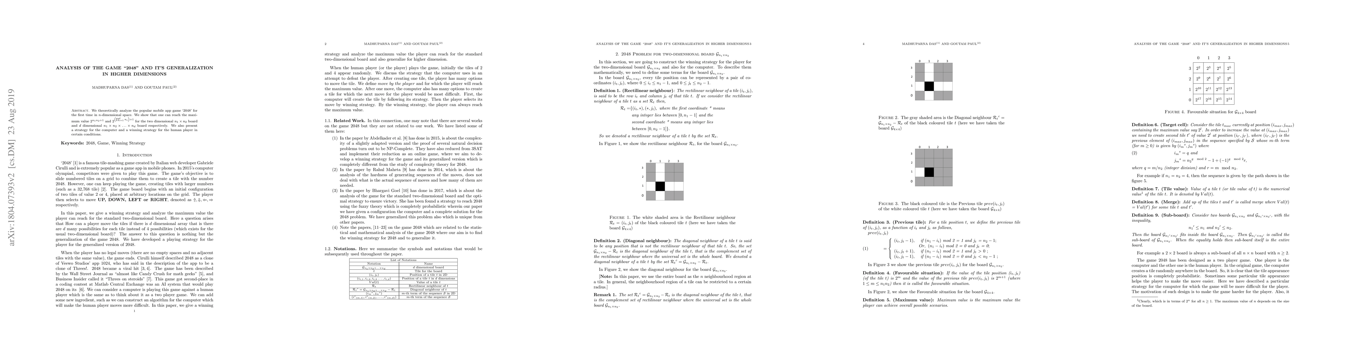 We theoretically analyze the popular mobile app game `2048' for the first time in $n$-dimensional space. We show that one can reach the maximum value $2^{n_1n_2+1}$ and $2^{\left({\prod_{i=1}^{d} n_i}\right)+1}$ for the two dimensional $n_1\times n_2$ board and $d$ dimensional $n_1\times n_2\times \ldots \times n_d$ board respectively. We also present a strategy for the computer and a winning strategy for the human player in certain conditions.
