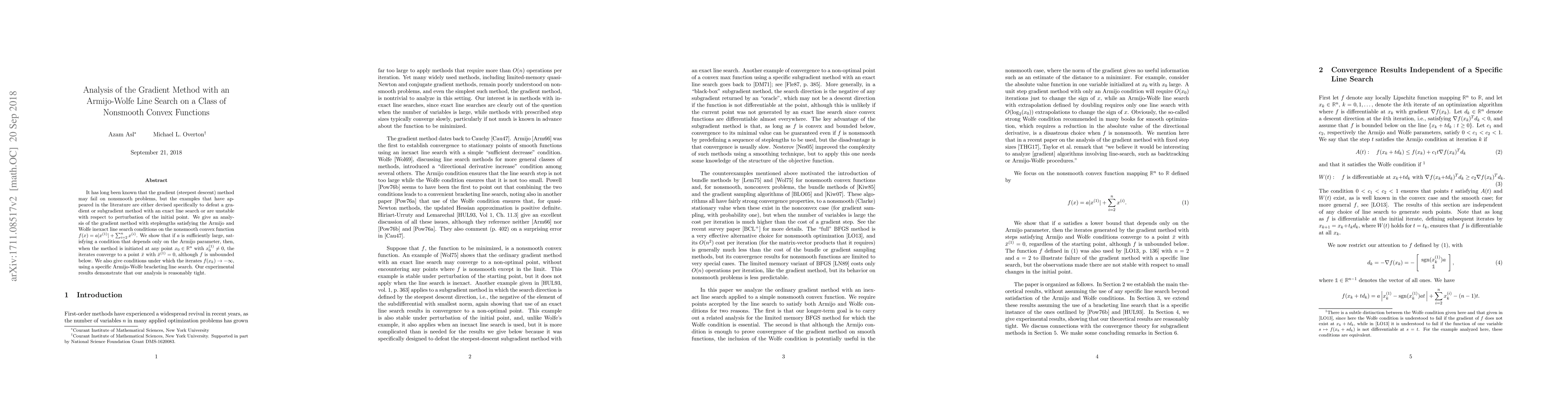 This paper analyzes the gradient method with Armijo-Wolfe line search on the nonsmooth convex function $f(x)$. It shows that under certain conditions, the method converges to a point where the first component is zero, even though the function is unbounded below. Experimental results support the theoretical analysis.