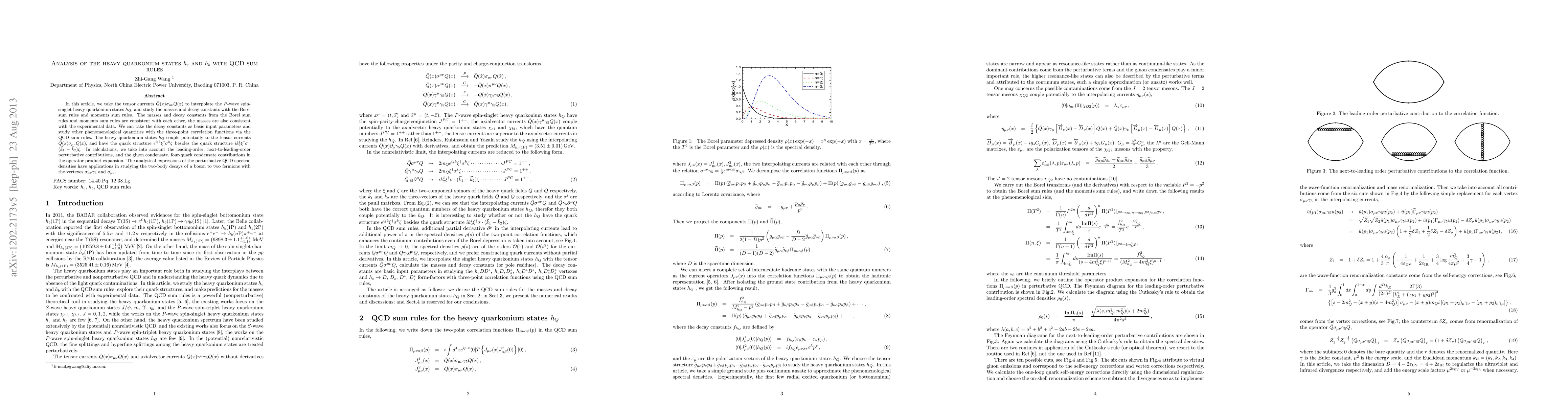 In this article, we take the tensor currents $\bar{Q}(x)\sigma_{\mu\nu}Q(x)$ to interpolate the $P$-wave spin-singlet heavy quarkonium states $h_Q$, and study the masses and decay constants with the Borel sum rules and moments sum rules. The masses and decay constants from the Borel sum rules and moments sum rules are consistent with each other, the masses are also consistent with the experimental data. We can take the decay constants as basic input parameters and study other phenomenological quantities with the three-point correlation functions via the QCD sum rules. The heavy quarkonium states $h_Q$ couple potentially to the tensor currents $\bar{Q}(x)\sigma_{\mu\nu}Q(x)$, and have the quark structure $\epsilon^{ijk}\xi^{\dagger}\sigma^k\zeta$ besides the quark structure $ik_2^i \xi^{\dagger}\sigma \cdot (\vec{k}_1-\vec{k}_2)\zeta $. In calculations, we take into account the leading-order, next-to-leading-order perturbative contributions, and the gluon condensate, four-quark condensate contributions in the operator product expansion. The analytical expressions of the perturbative QCD spectral densities have applications in studying the two-body decays of a boson to two fermions with the vertexes $\sigma_{\mu\nu}\gamma_5$ and $\sigma_{\mu\nu}$.