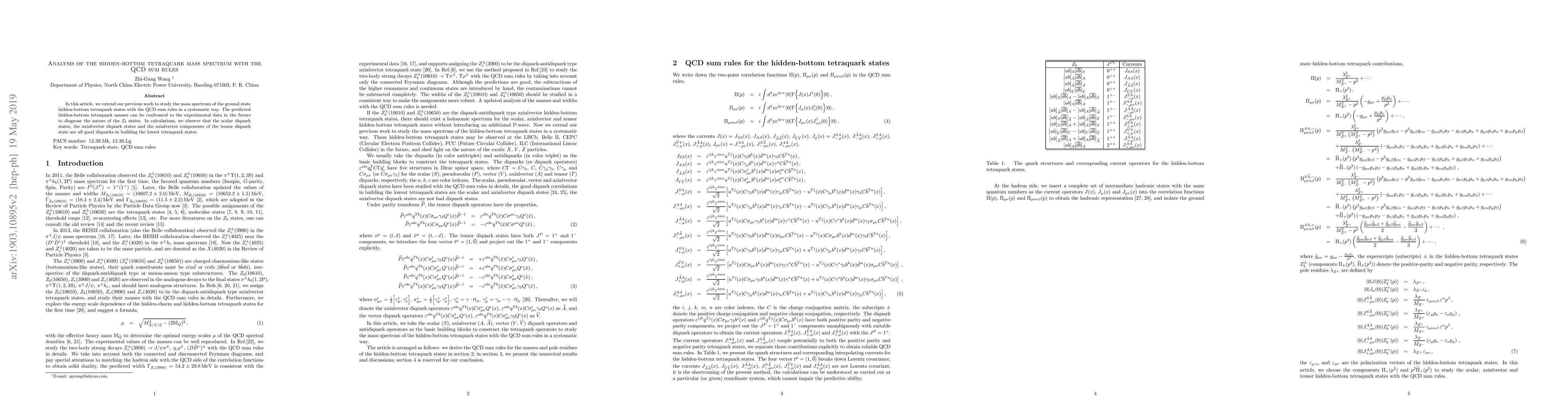 In this article, we extend our previous work to study the mass spectrum of the ground state hidden-bottom tetraquark states with the QCD sum rules in a systematic way. The predicted hidden-bottom tetraquark masses can be confronted to the experimental data in the future to diagnose the nature of the $Z_b$ states. In calculations, we observe that the scalar diquark states, the axialvector diquark states and the axialvector components of the tensor diquark state are all good diquarks in building the lowest tetraquark states.