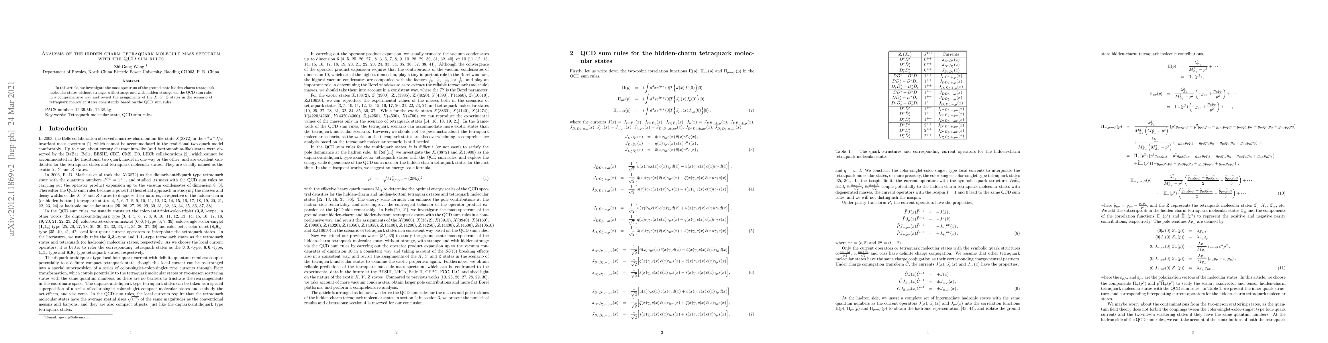 In this article, we investigate the mass spectrum of the ground state hidden-charm tetraquark molecular states without strange, with strange and with hidden-strange via the QCD sum rules in a comprehensive way and revisit the assignments of the $X$, $Y$, $Z$ states in the scenario of tetraquark molecular states consistently based on the QCD sum rules.