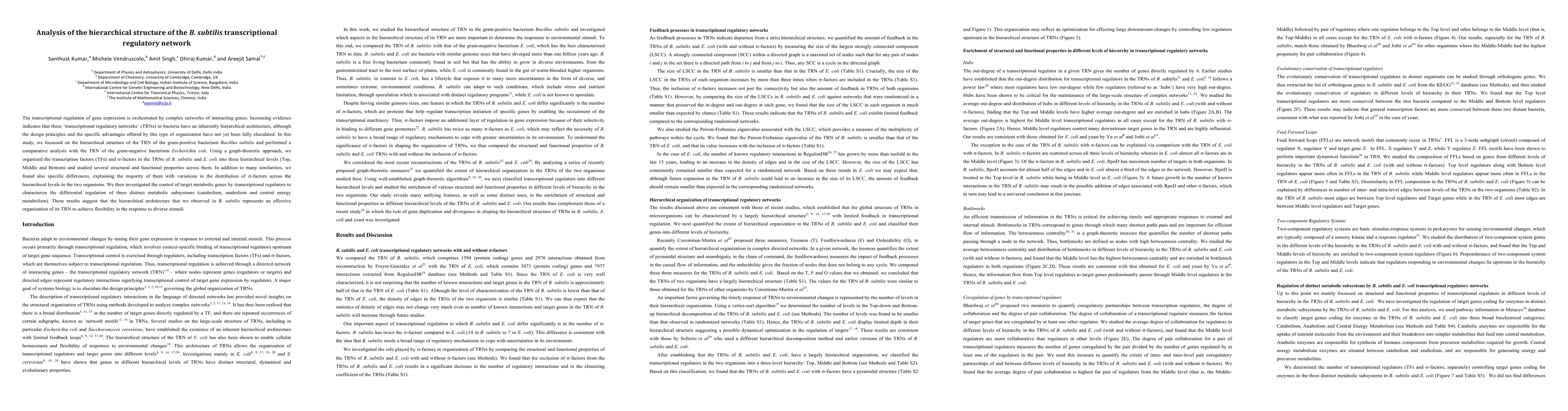 This study analyzes the hierarchical structure of Bacillus subtilis's transcriptional regulatory network, comparing it with Escherichia coli's TRN. It reveals distinct hierarchical levels of transcription factors and sigma-factors, highlighting differences primarily due to sigma-factor distribution, and suggests that B. subtilis's hierarchical organization enhances flexibility in metabolic regulation.