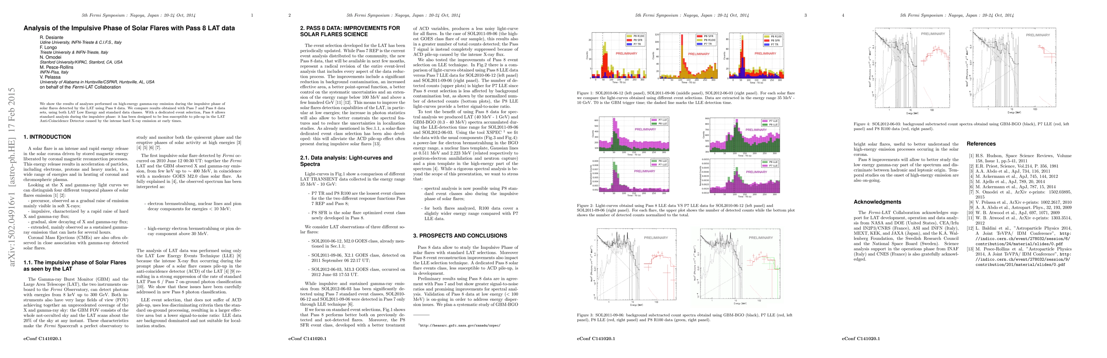 This paper analyzes high-energy gamma-ray emissions during the impulsive phase of solar flares using Pass 8 data from the LAT, comparing it with Pass 7 data. Pass 8 is shown to be less prone to pile-up, allowing for more accurate analysis during the intense early phase of solar flares.