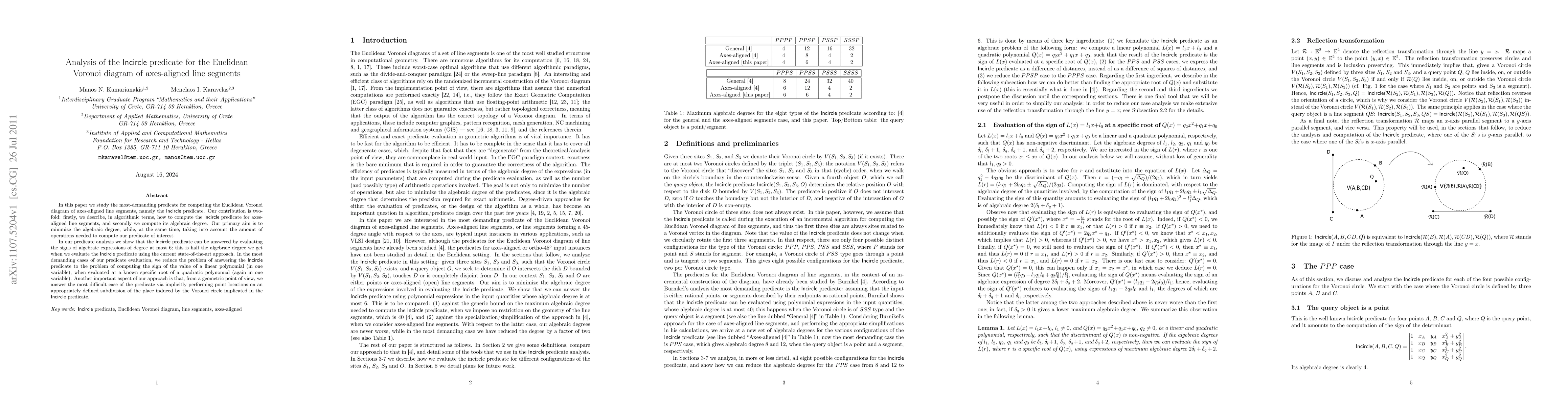 This paper presents an efficient algorithm to compute the Incircle predicate for the Euclidean Voronoi diagram of axes-aligned line segments, reducing the algebraic degree from the current state-of-the-art by half, and evaluates the signs of algebraic expressions of degree at most 6. The authors also implicitly perform point locations on a defined subdivision to handle the most challenging cases.
