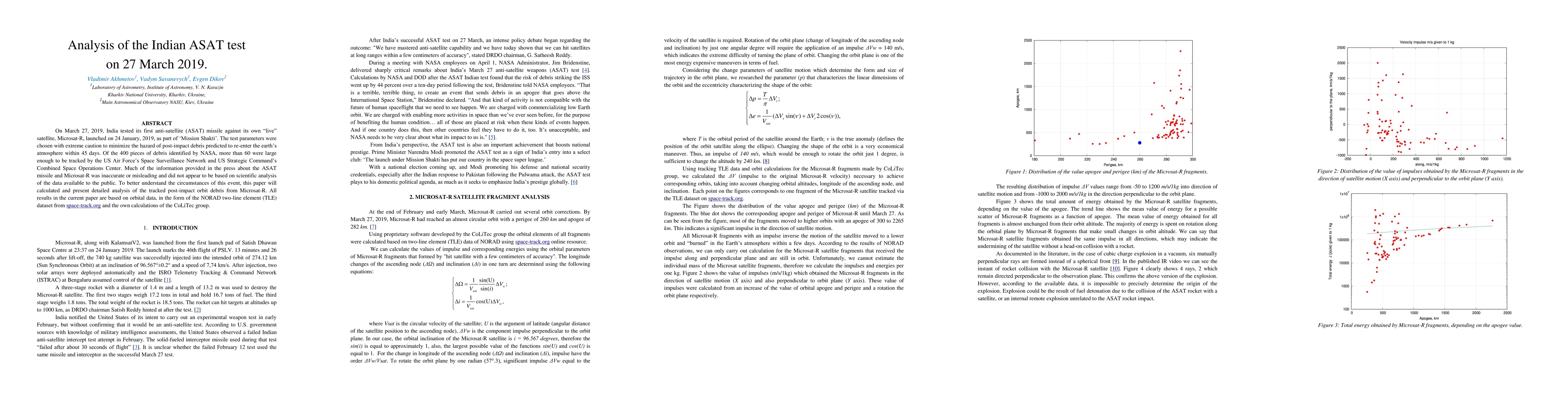 This paper analyzes the Indian ASAT test conducted on March 27, 2019, which destroyed its own satellite Microsat-R. It focuses on the post-impact debris, using NORAD two-line element datasets and CoLiTec group calculations to provide a detailed assessment, correcting inaccuracies in public reports.