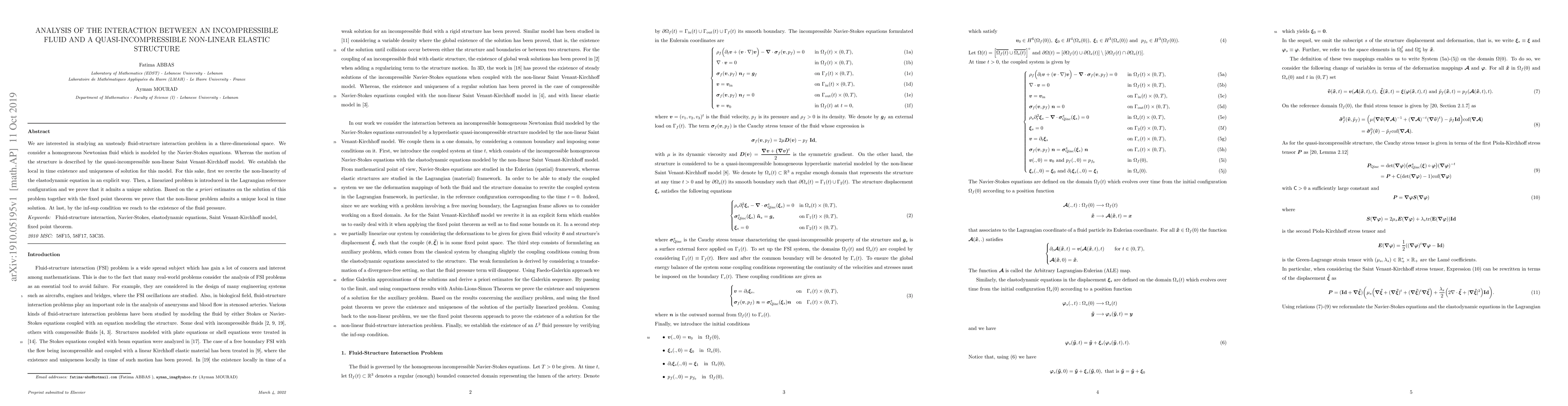This paper investigates the interaction between an incompressible fluid and a quasi-incompressible non-linear elastic structure, establishing local in time existence and uniqueness of solutions. It employs the Navier-Stokes equations for the fluid and the Saint Venant-Kirchhoff model for the structure, proving the existence of a unique solution via a linearized problem and fixed point theorem.