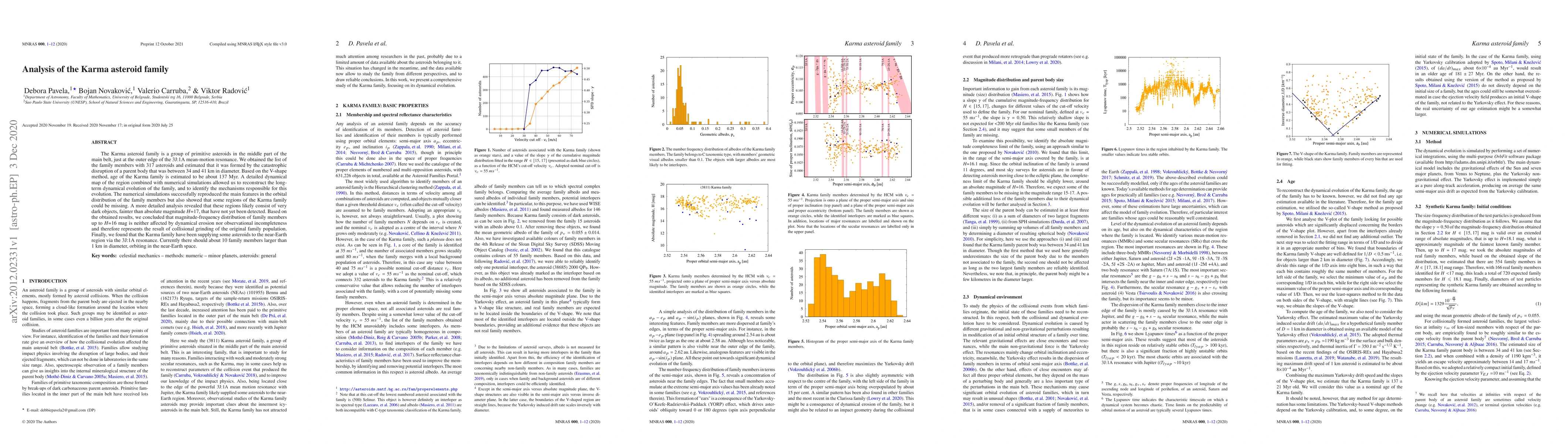 The Karma asteroid family is a group of primitive asteroids in the middle part of the main belt, just at the outer edge of the 3J:1A mean-motion resonance. We obtained the list of the family members with 317 asteroids and estimated that it was formed by the catastrophic disruption of a parent body that was between 34 and 41 km in diameter. Based on the V-shape method, age of the Karma family is estimated to be about 137 Myr. A detailed dynamical map of the region combined with numerical simulations allowed us to reconstruct the long-term dynamical evolution of the family, and to identify the mechanisms responsible for this evolution. The numerical simulations successfully reproduced the main features in the orbital distribution of the family members but also showed that some regions of the Karma family could be missing. A more detailed analysis revealed that these regions likely consist of very dark objects, fainter than absolute magnitude H = 17, that have not yet been detected. Based on the obtained results, we concluded that magnitude-frequency distribution of family members up to H = 16 mag is neither affected by dynamical erosion nor observational incompleteness and therefore represents the result of collisional grinding of the original family population. Finally, we found that the Karma family have been supplying some asteroids to the near-Earth region via the 3J:1A resonance. Currently, there should about 10 family members larger than 1 km in diameter, orbiting in the near-Earth space.