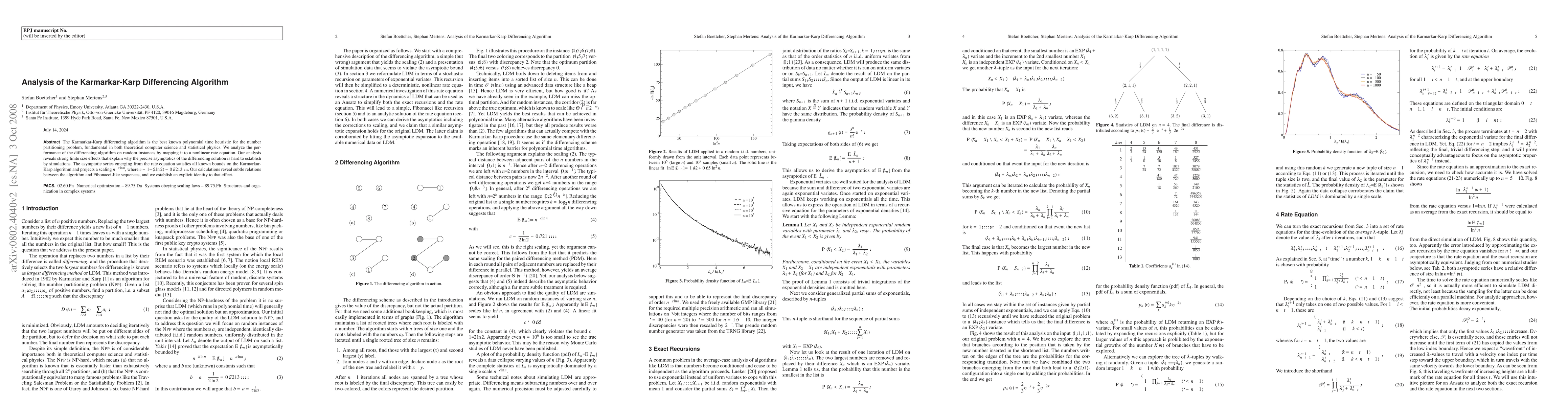 The Karmarkar-Karp differencing algorithm has a scaling complexity of $n^{-c au n}$, where $c=0.7213$, indicating a fast solution for large instances of the number partitioning problem.
