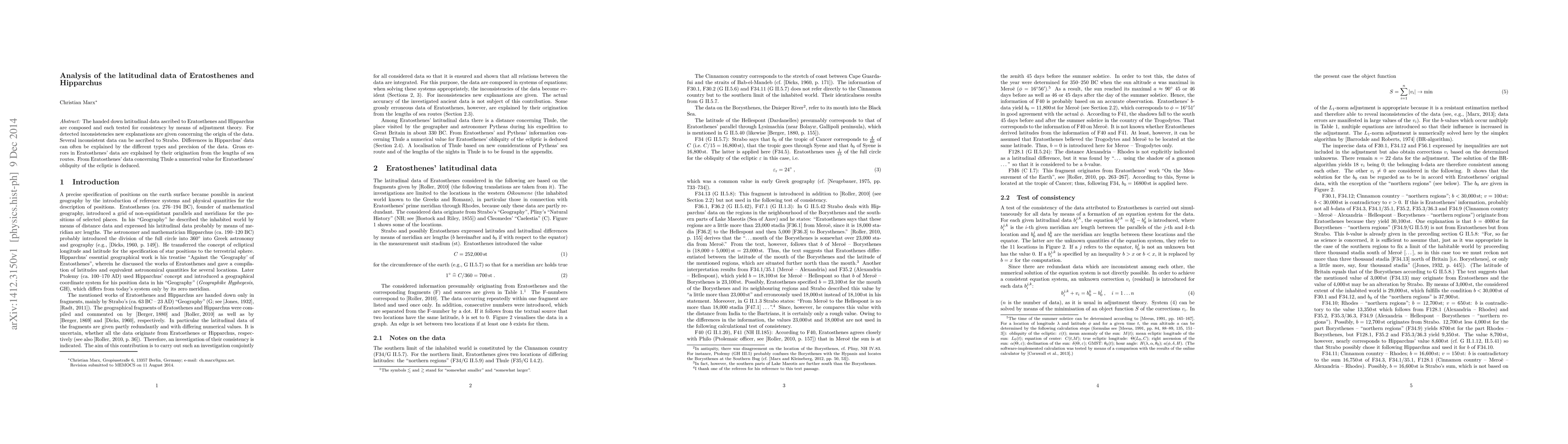 Researchers analyzed Eratosthenes' and Hipparchus' latitudinal data, identifying inconsistencies and providing new explanations for the data's origins, with implications for understanding ancient Greek geography and astronomy.
