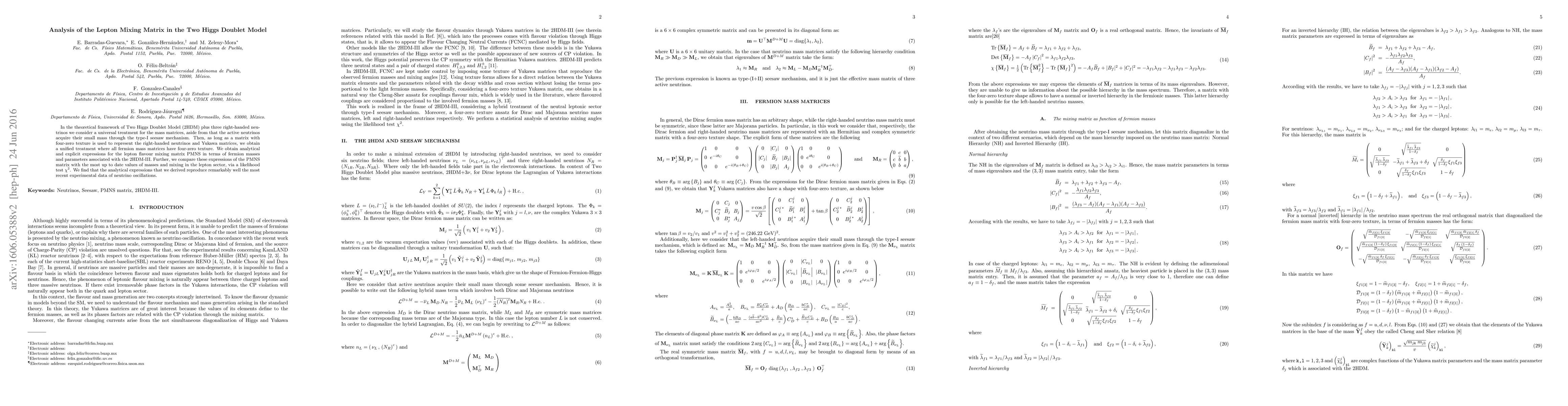 In the theoretical framework of Two Higgs Doublet Model (2HDM) plus three right-handed neutrinos we consider a universal treatment for the mass matrices, aside from that the active neutrinos acquire their small mass through the type-I seesaw mechanism. Then, as long as a matrix with four-zero texture is used to represent the right-handed neutrinos and Yukawa matrices, we obtain a unified treatment where all fermion mass matrices have four-zero texture. We obtain analytical and explicit expressions for the lepton flavour mixing matrix PMNS in terms of fermion masses and parameters associated with the 2HDM-III. Further, we compare these expressions of the PMNS matrix with the most up to date values of masses and mixing in the lepton sector, via a likelihood test $\chi^{2}$. We find that the analytical expressions that we derived reproduce remarkably well the most recent experimental data of neutrino oscillations.