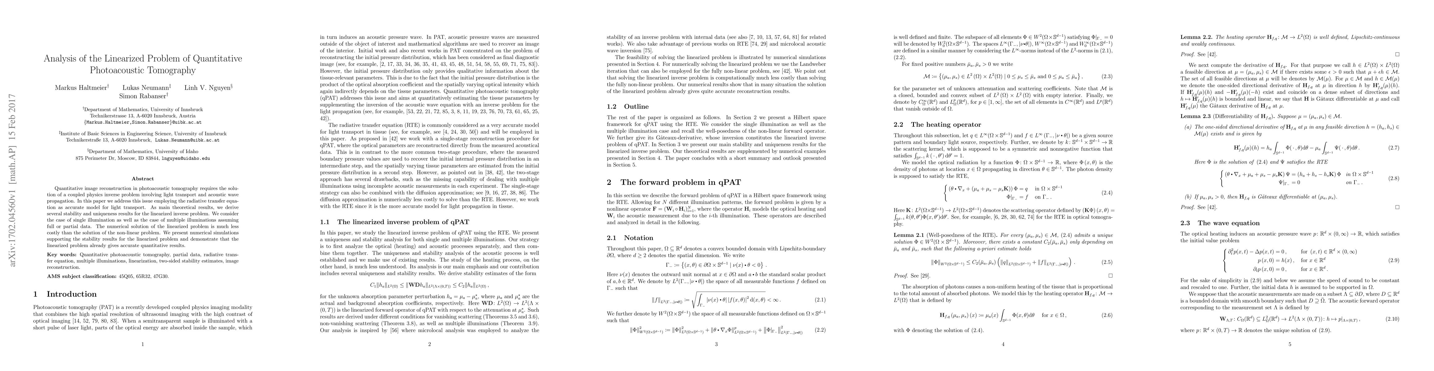 Quantitative image reconstruction in photoacoustic tomography requires the solution of a coupled physics inverse problem involvier light transport and acoustic wave propagation. In this paper we address this issue employing the radiative transfer equation as accurate model for light transport. As main theoretical results, we derive several stability and uniqueness results for the linearized inverse problem. We consider the case of single illumination as well as the case of multiple illuminations assuming full or partial data. The numerical solution of the linearized problem is much less costly than the solution of the non-linear problem. We present numerical simulations supporting the stability results for the linearized problem and demonstrate that the linearized problem already gives accurate quantitative results.