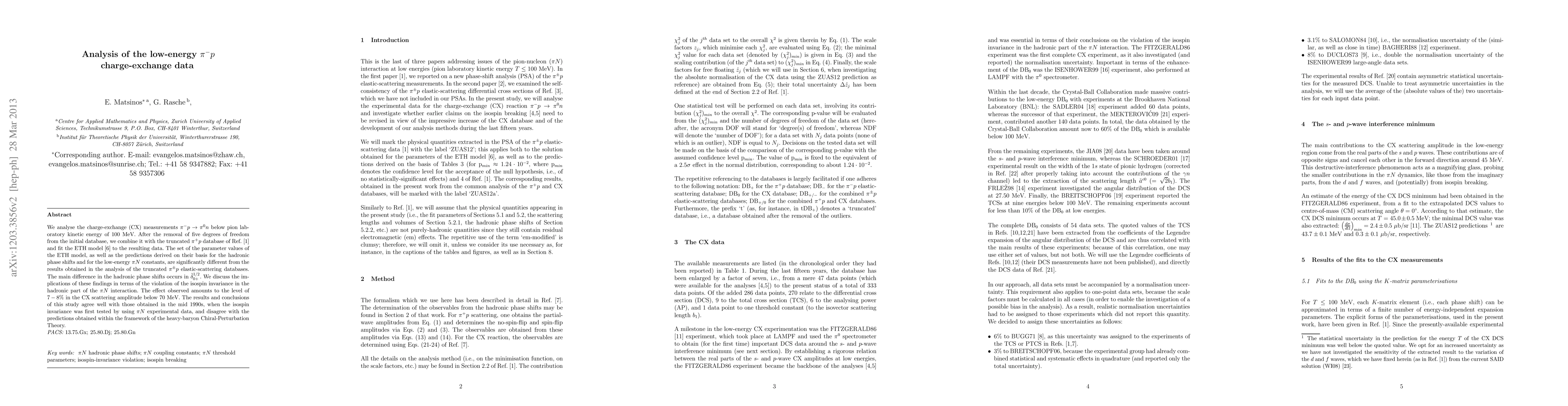 We analyse the charge-exchange (CX) measurements $\pi^- p\rightarrow \pi^0 n$ below pion laboratory kinetic energy of 100 MeV. After the removal of five degrees of freedom from the initial database, we combine it with the truncated $\pi^+ p$ database of Ref. \cite{mrw1} and fit the ETH model \cite{glmbg} to the resulting data. The set of the parameter values of the ETH model, as well as the predictions derived on their basis for the hadronic phase shifts and for the low-energy $\pi N$ constants, are significantly different from the results obtained in the analysis of the truncated $\pi^\pm p$ elastic-scattering databases. The main difference in the hadronic phase shifts occurs in $\tilde{\delta}_{0+}^{1/2}$. We discuss the implications of these findings in terms of the violation of the isospin invariance in the hadronic part of the $\pi N$ interaction. The effect observed amounts to the level of $7-8 %$ in the CX scattering amplitude below 70 MeV. The results and conclusions of this study agree well with those obtained in the mid 1990s, when the isospin invariance was first tested by using $\pi N$ experimental data, and disagree with the predictions obtained within the framework of the heavy-baryon Chiral-Perturbation Theory.