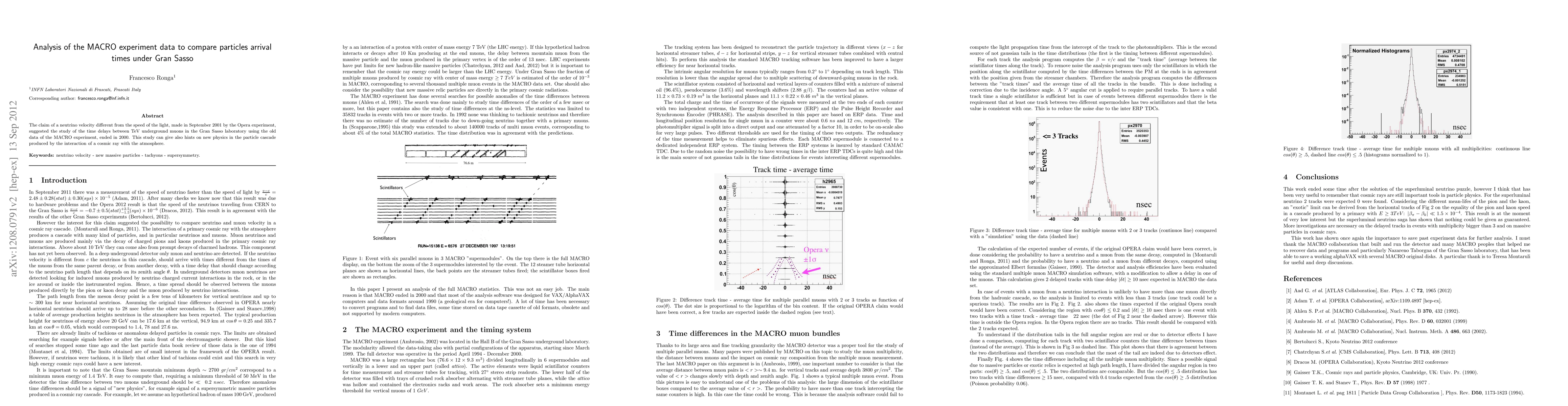 Summary: This paper analyzes MACRO experiment data to investigate potential time delays in TeV muons at Gran Sasso, prompted by the Opera experiment's claim of superluminal neutrino velocities, and to explore possible new physics in cosmic ray-induced particle cascades.