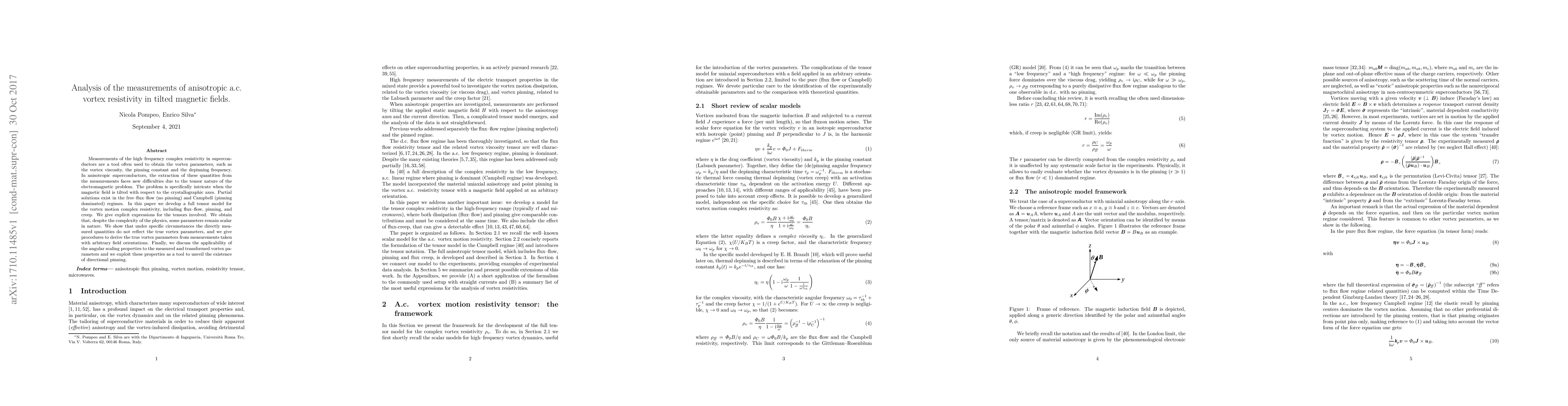 This research presents a comprehensive tensor model for vortex motion complex resistivity in anisotropic superconductors under tilted magnetic fields, identifying certain scalar parameters. It reveals discrepancies between directly measured quantities and true vortex parameters, offering procedures to rectify this, and discusses the use of angular scaling properties to detect directional pinning.