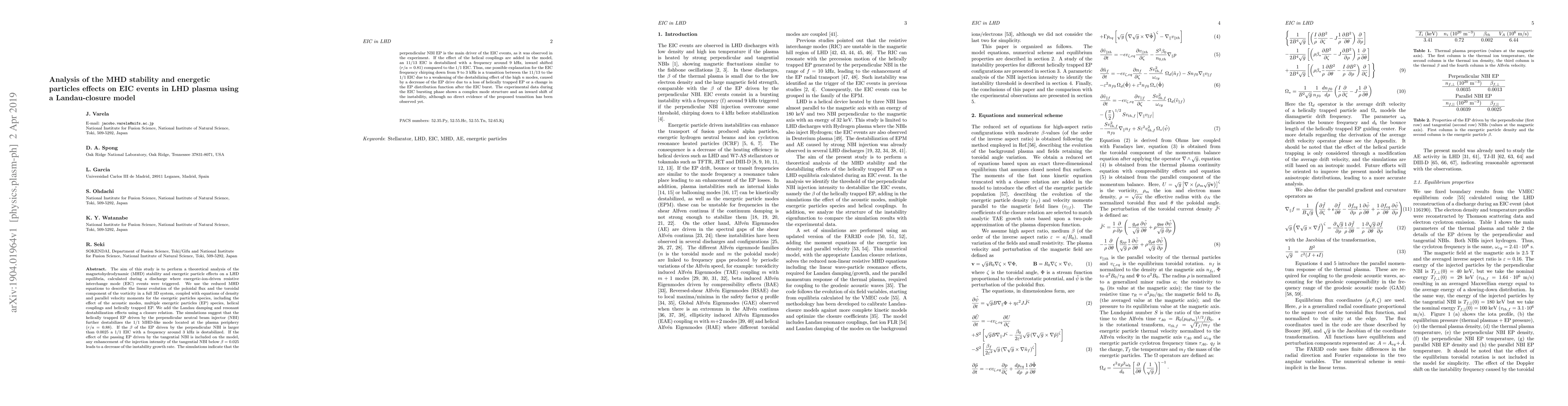 This study analyzes MHD stability and energetic particle effects on EIC events in LHD plasma using a Landau-closure model, finding that perpendicular NBI-driven energetic particles destabilize the 1/1 MHD mode, while tangential NBI effects reduce instability growth. The transition between 11/13 and 1/1 EIC modes suggests frequency chirping due to changes in energetic particle distributions.