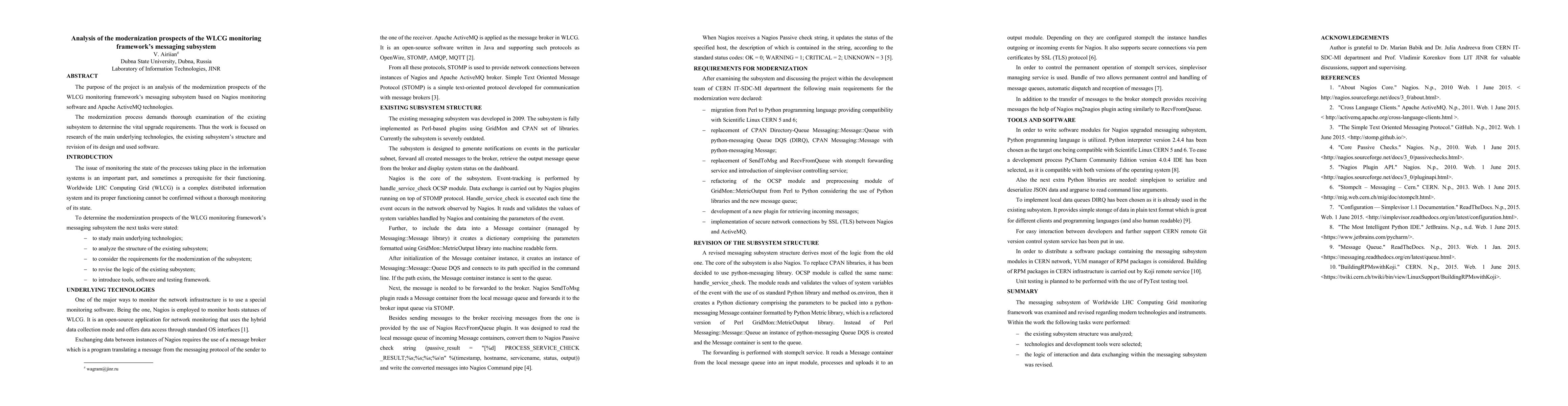 The purpose of the project is an analysis of the modernization prospects of the WLCG monitoring framework's messaging subsystem based on Nagios monitoring software and Apache ActiveMQ technologies. The modernization process demands thorough examination of the existing subsystem to determine the vital upgrade requirements. Thus the work is focused on research of the main underlying technologies, the existing subsystem's structure and revision of its design and used software.