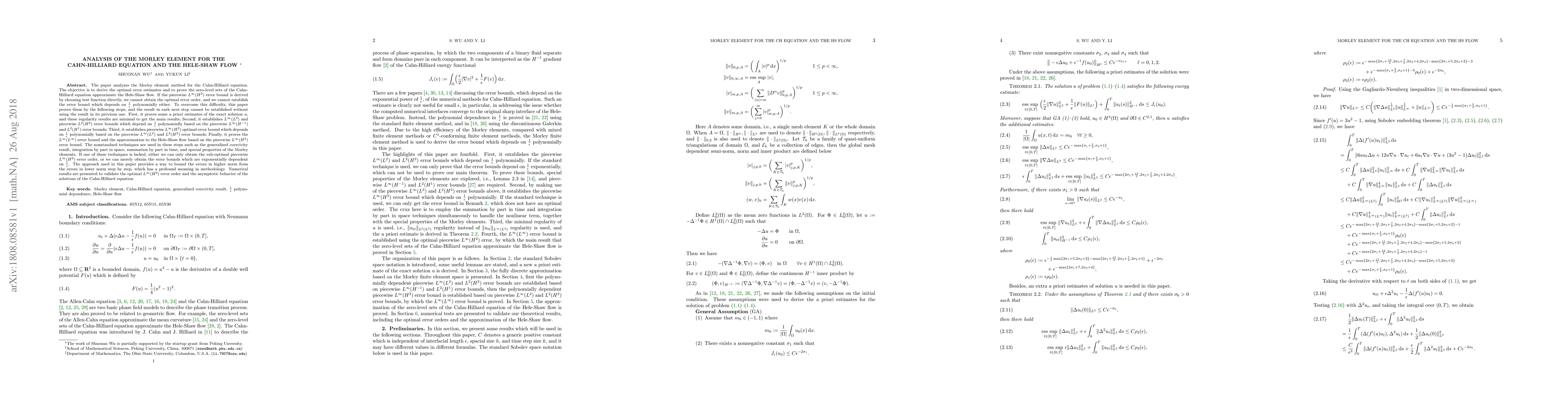 The paper analyzes the Morley element method for the Cahn-Hilliard equation. The objective is to derive the optimal error estimates and to prove the zero-level sets of the Cahn-Hilliard equation approximate the Hele-Shaw flow. If the piecewise $L^{\infty}(H^2)$ error bound is derived by choosing test function directly, we cannot obtain the optimal error order, and we cannot establish the error bound which depends on $\frac{1}{\epsilon}$ polynomially either. To overcome this difficulty, this paper proves them by the following steps, and the result in each next step cannot be established without using the result in its previous one. First, it proves some a priori estimates of the exact solution $u$, and these regularity results are minimal to get the main results; Second, it establishes ${L^{\infty}(L^2)}$ and piecewise ${L^2(H^2)}$ error bounds which depend on $\frac{1}{\epsilon}$ polynomially based on the piecewise ${L^{\infty}(H^{-1})}$ and ${L^2(H^1)}$ error bounds; Third, it establishes piecewise ${L^{\infty}(H^2)}$ optimal error bound which depends on $\frac{1}{\epsilon}$ polynomially based on the piecewise ${L^{\infty}(L^2)}$ and ${L^2(H^2)}$ error bounds; Finally, it proves the ${L^\infty(L^\infty)}$ error bound and the approximation to the Hele-Shaw flow based on the piecewise ${L^{\infty}(H^2)}$ error bound. The nonstandard techniques are used in these steps such as the generalized coercivity result, integration by part in space, summation by part in time, and special properties of the Morley elements. If one of these techniques is lacked, either we can only obtain the sub-optimal piecewise ${L^{\infty}(H^2)}$ error order, or we can merely obtain the error bounds which are exponentially dependent on $\frac{1}{\epsilon}$. Numerical results are presented to validate the optimal $L^\infty(H^2)$ error order and the asymptotic behavior of the solutions of the Cahn-Hilliard equation.