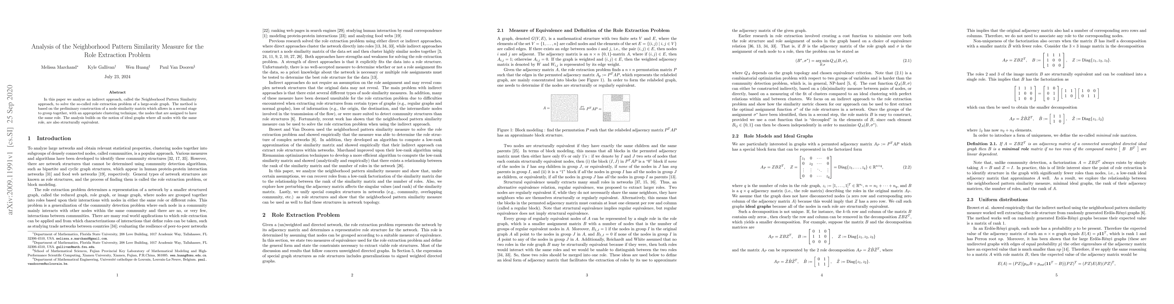 In this paper we analyze an indirect approach, called the Neighborhood Pattern Similarity approach, to solve the so-called role extraction problem of a large-scale graph. The method is based on the preliminary construction of a node similarity matrix which allows in a second stage to group together, with an appropriate clustering technique, the nodes that are assigned to have the same role. The analysis builds on the notion of ideal graphs where all nodes with the same role, are also structurally equivalent.