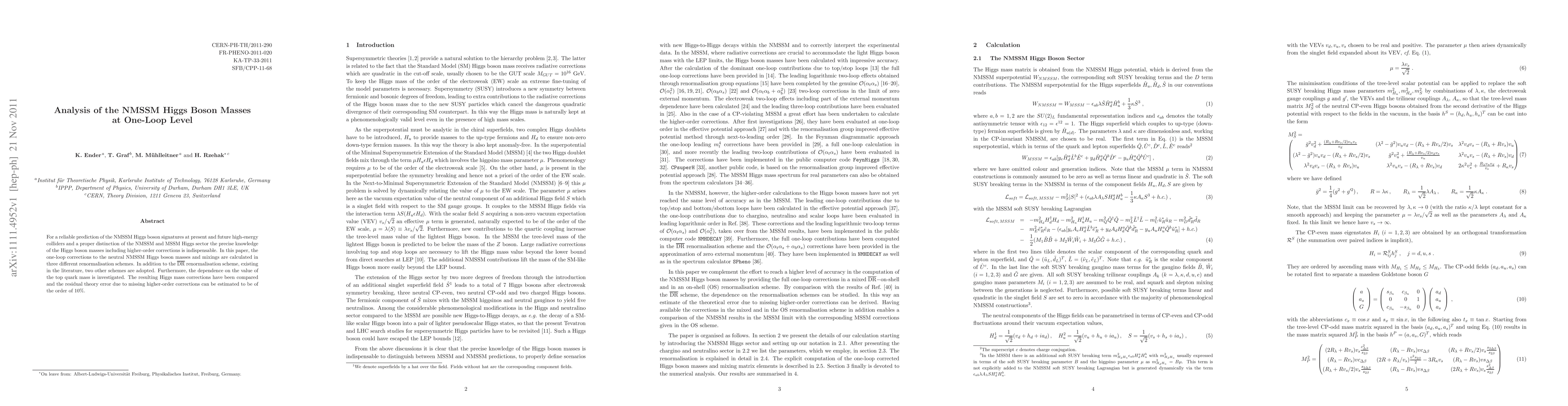 This paper calculates one-loop corrections to neutral Higgs boson masses in the Next-to-Minimal Supersymmetric Standard Model (NMSSM), comparing results across three renormalization schemes and assessing the impact of the top quark mass. It estimates the remaining theory error due to higher-order corrections to be around 10%.