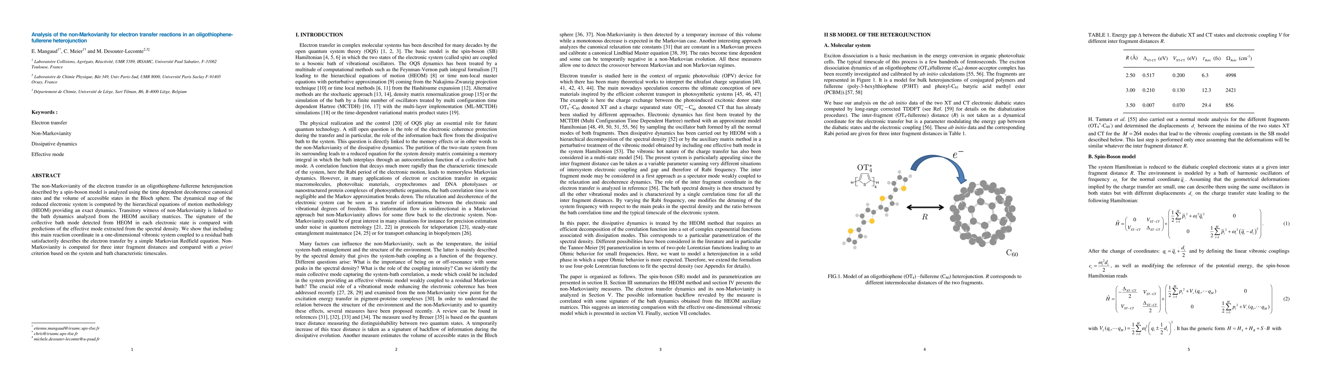 The non-Markovianity of the electron transfer in an oligothiophene-fullerene heterojunction described by a spin-boson model is analyzed using the time dependent decoherence canonical rates and the volume of accessible states in the Bloch sphere. The dynamical map of the reduced electronic system is computed by the hierarchical equations of motion methodology (HEOM) providing an exact dynamics. Transitory witness of non-Markovianity is linked to the bath dynamics analyzed from the HEOM auxiliary matrices. The signature of the collective bath mode detected from HEOM in each electronic state is compared with predictions of the effective mode extracted from the spectral density. We show that including this main reaction coordinate in a one-dimensional vibronic system coupled to a residual bath satisfactorily describes the electron transfer by a simple Markovian Redfield equation. Non-Markovianity is computed for three inter fragment distances and compared with a priori criterion based on the system and bath characteristic timescales.