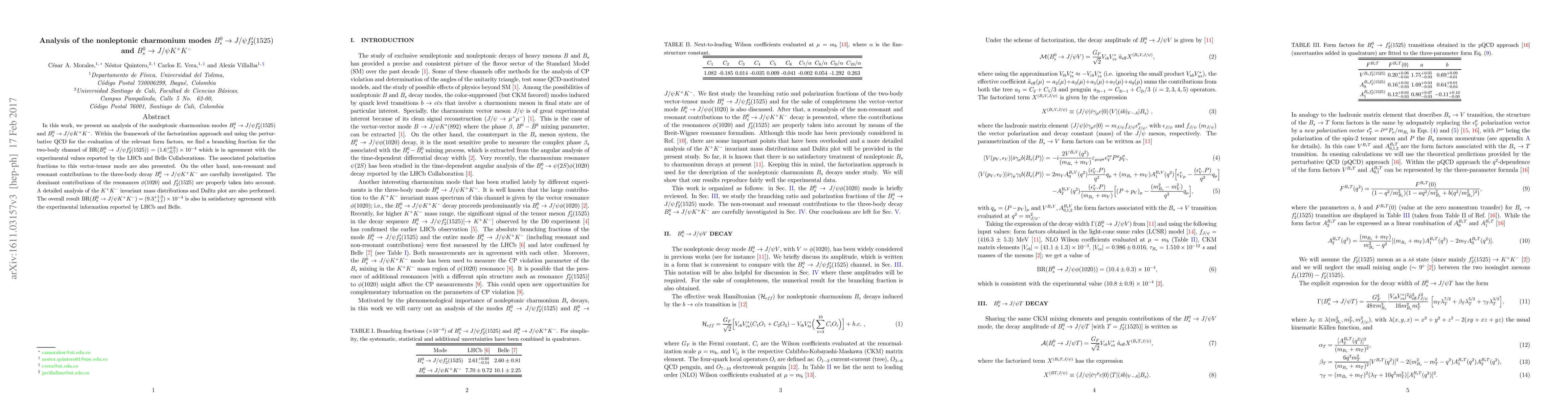 In this work, we present an analysis of the nonleptonic charmonium modes $B_s^0 \to J / \psi f_2^\prime(1525)$ and $B_s^0 \to J/\psi K^+K^-$. Within the framework of the factorization approach and using the perturbative QCD for the evaluation of the relevant form factors, we find a branching fraction for the two-body channel of BR$(B_s^{0} \to J/\psi f_2^{\prime}(1525)) = (1.6 {}^{+0.9}_{-0.7})\times 10^{-4}$ which is in agreement with the experimental values reported by the LHCb and Belle Collaborations. The associated polarization fractions to this vector-tensor mode are also presented. On the other hand, non-resonant and resonant contributions to the three-body decay $B_s^0 \to J/\psi K^+K^-$ are carefully investigated. The dominant contributions of the resonances $ \phi(1020)$ and $f_2^{\prime}(1525)$ are properly taken into account. A detailed analysis of the $K^+ K^-$ invariant mass distributions and Dalitz plot are also performed. The overall result BR$(B_s^{0} \to J/\psi K^+ K^-) = (9.3^{+1.3}_{-1.1})\times 10^{-4}$ is also in satisfactory agreement with the experimental information reported by LHCb and Belle.