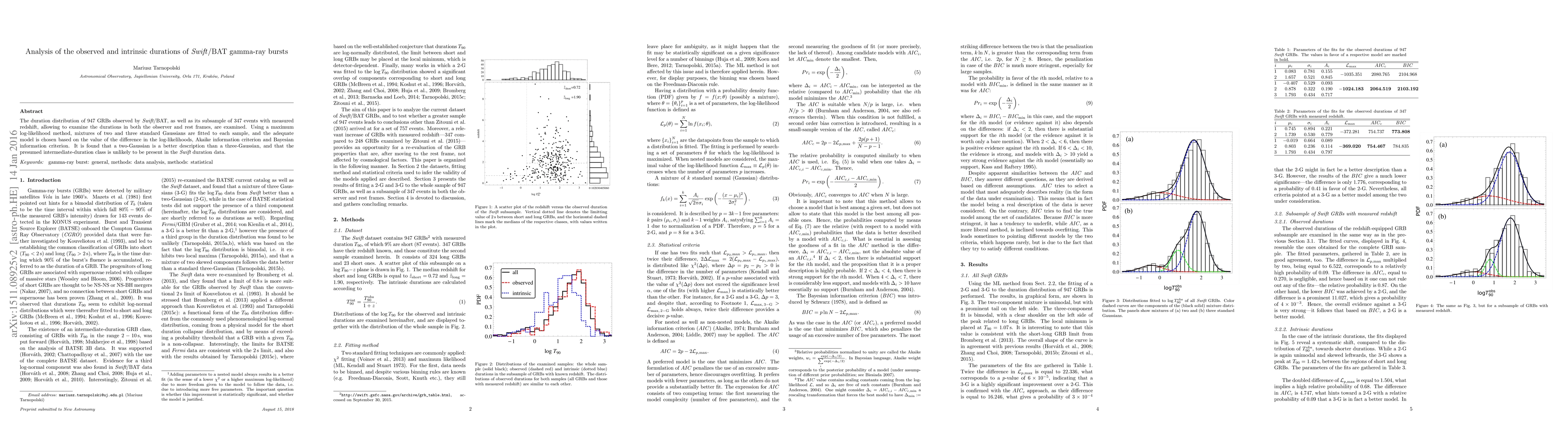 A study of 947 gamma-ray bursts observed by Swift/BAT found that a two-Gaussian model is the best fit for describing their duration distribution, ruling out an intermediate-duration class.