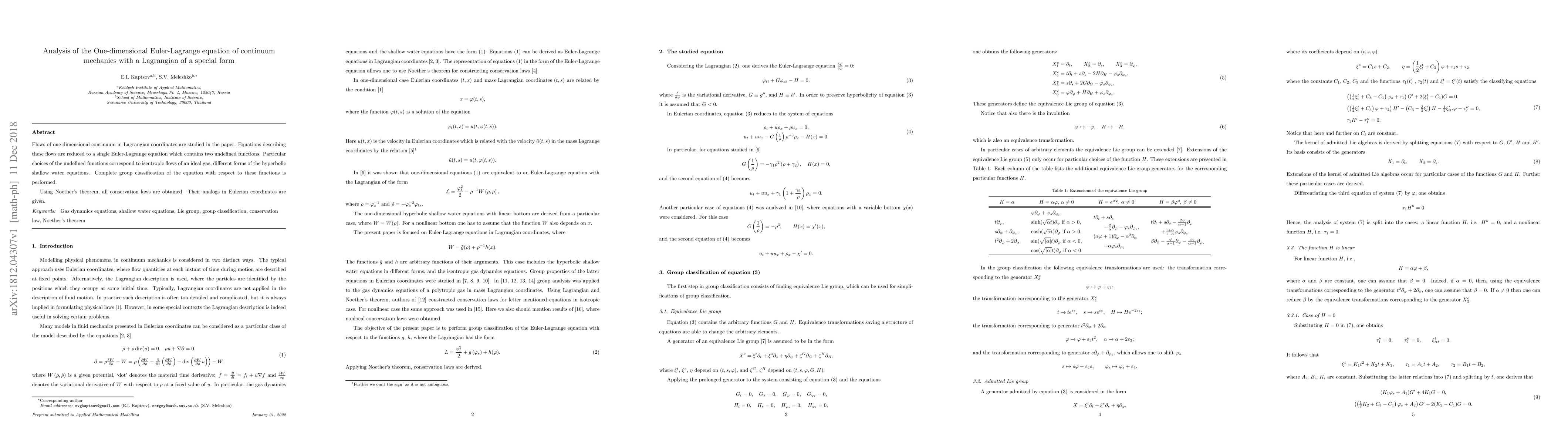 Flows of one-dimensional continuum in Lagrangian coordinates are studied in the paper. Equations describing these flows are reduced to a single Euler-Lagrange equation which contains two undefined functions. Particular choices of the undefined functions correspond to isentropic flows of an ideal gas, different forms of the hyperbolic shallow water equations. Complete group classification of the equation with respect to these functions is performed. Using Noether's theorem, all conservation laws are obtained. Their analogs in Eulerian coordinates are given.