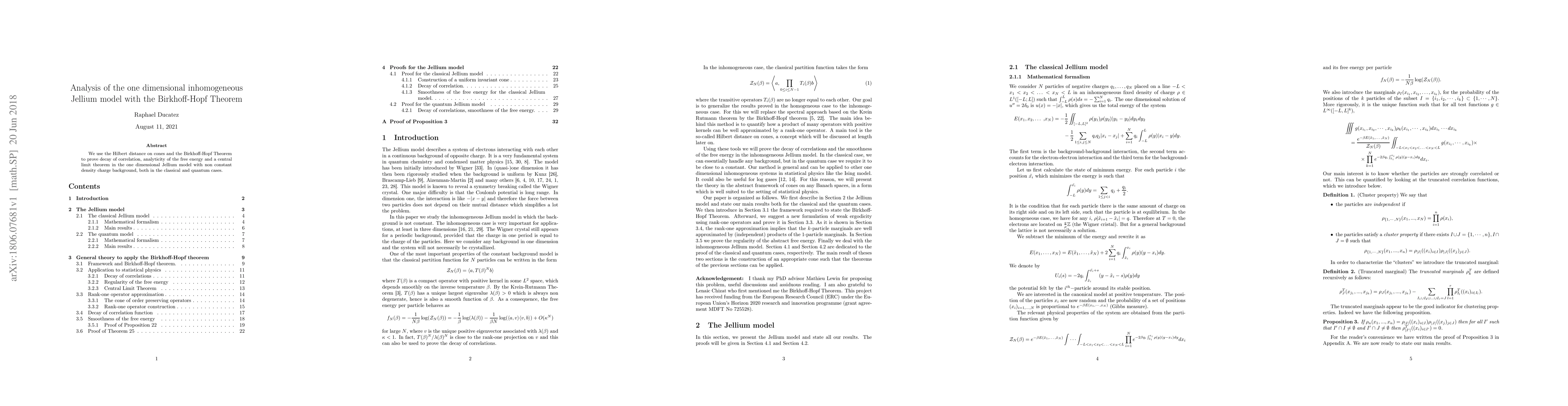 Summary: This paper employs the Hilbert distance on cones and the Birkhoff-Hopf Theorem to demonstrate decay of correlation, analyticity of free energy, and a central limit theorem in the one-dimensional inhomogeneous Jellium model, applicable to both classical and quantum scenarios.