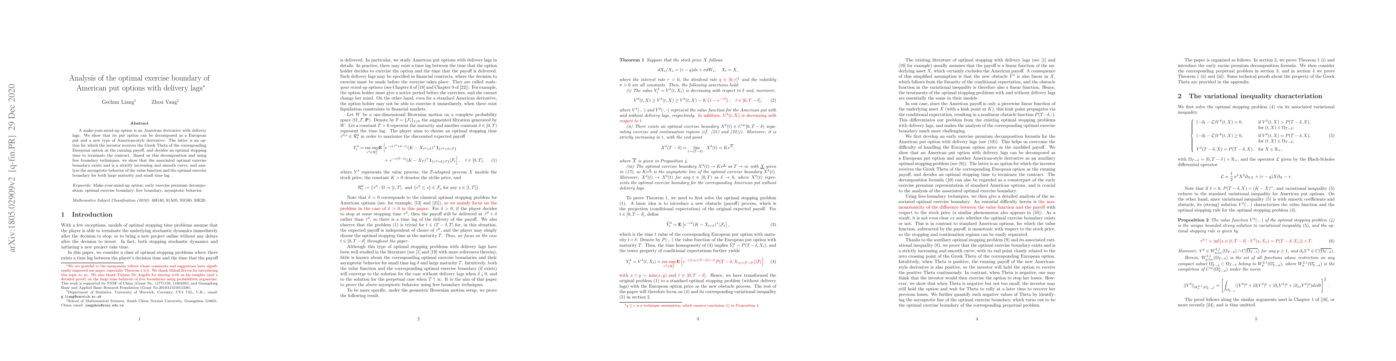 A make-your-mind-up option is an American derivative with delivery lags. We show that its put option can be decomposed as a European put and a new type of American-style derivative. The latter is an option for which the investor receives the Greek Theta of the corresponding European option as the running payoff, and decides an optimal stopping time to terminate the contract. Based on this decomposition and using free boundary techniques, we show that the associated optimal exercise boundary exists and is a strictly increasing and smooth curve, and analyze the asymptotic behavior of the value function and the optimal exercise boundary for both large maturity and small time lag.