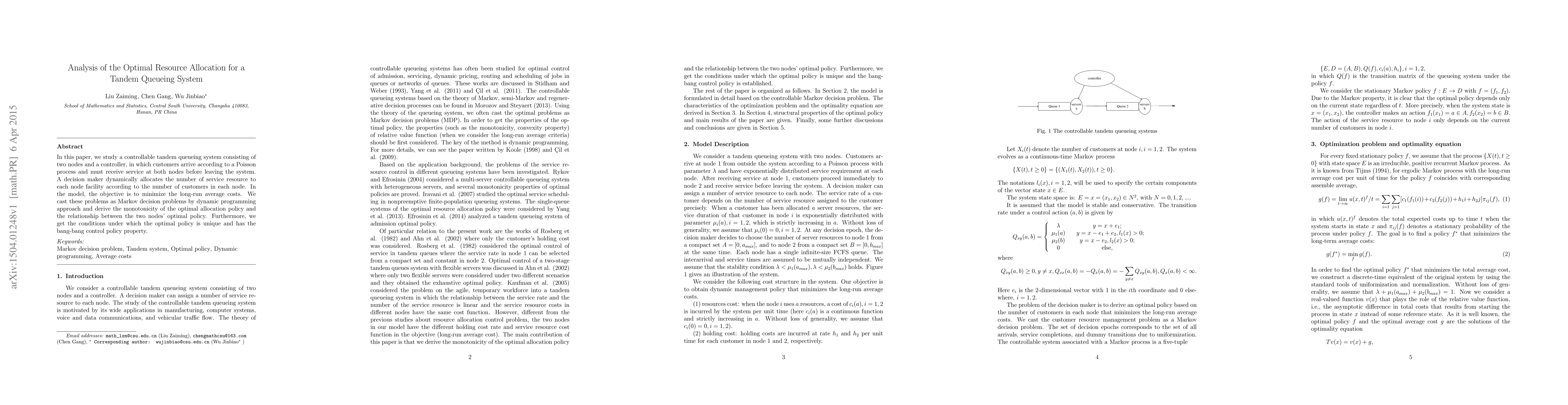 In this paper, we study a controllable tandem queueing system consisting of two nodes and a controller, in which customers arrive according to a Poisson process and must receive service at both nodes before leaving the system. A decision maker dynamically allocates the number of service resource to each node facility according to the number of customers in each node. In the model, the objective is to minimize the long-run average costs. We cast these problems as Markov decision problems by dynamic programming approach and derive the monotonicity of the optimal allocation policy and the relationship between the two nodes' optimal policy. Furthermore, we get the conditions under which the optimal policy is unique and has the bang-bang control policy property.