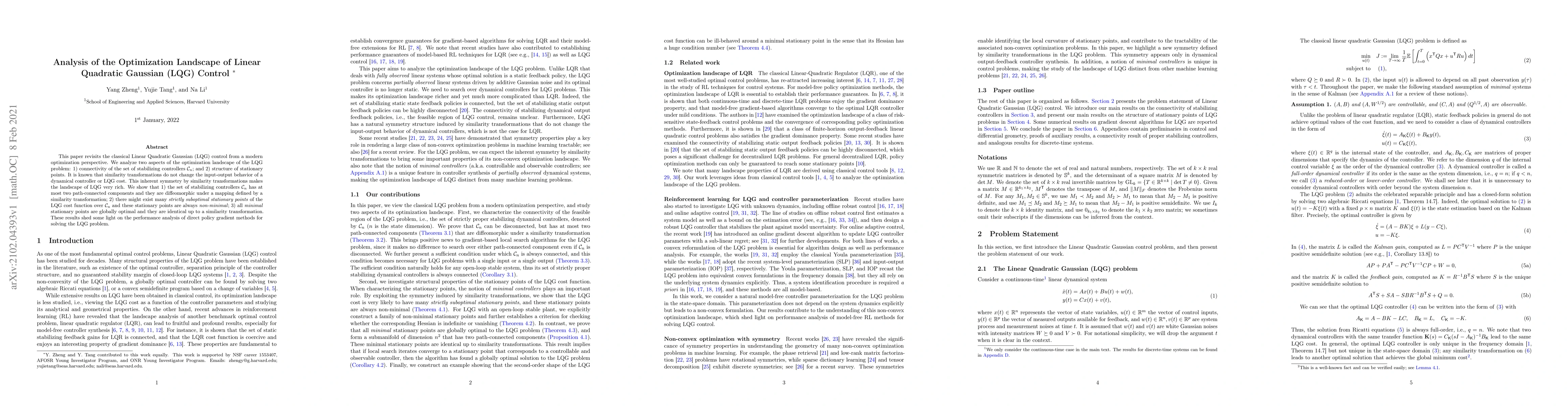 This paper analyzes the optimization landscape of Linear Quadratic Gaussian (LQG) control, showing that the set of stabilizing controllers has at most two path-connected components and that all minimal stationary points are globally optimal, while strictly suboptimal stationary points exist and are non-minimal.