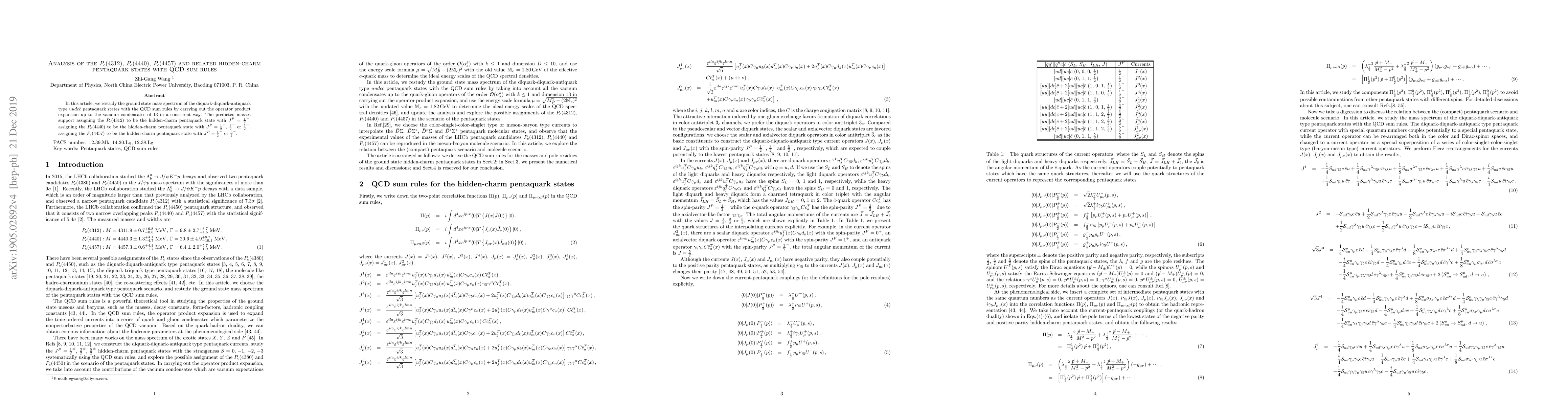 This paper reanalyzes the mass spectrum of $uudc\bar{c}$ pentaquark states using QCD sum rules, predicting specific $J^P$ values for $P_c(4312)$, $P_c(4440)$, and $P_c(4457)$ and supporting their classification as hidden-charm pentaquarks. The study employs operator product expansion up to vacuum condensates of order 13.