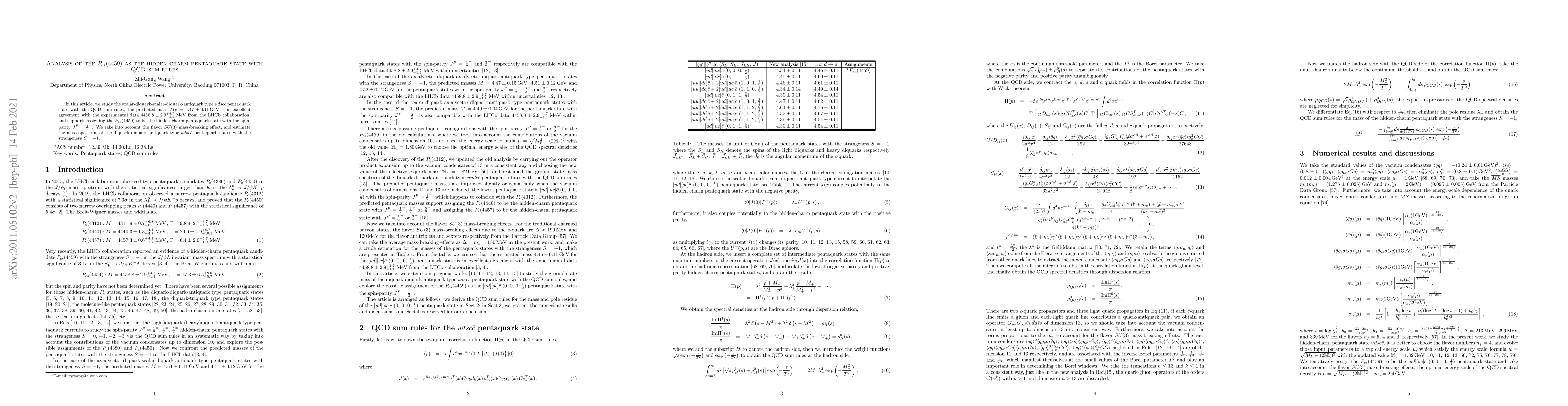 In this article, we study the scalar-diquark-scalar-diquark-antiquark type $udsc\bar{c}$ pentaquark state with the QCD sum rules, the predicted mass $M_P=4.47\pm0.11\,\rm{GeV}$ is in excellent agreement with the experimental data $ 4458.8 \pm 2.9 {}^{+4.7}_{-1.1} \mbox{ MeV}$ from the LHCb collaboration, and supports assigning the $P_{cs}(4459)$ to be the hidden-charm pentaquark state with the spin-parity $J^P={\frac{1}{2}}^-$. We take into account the flavor $SU(3)$ mass-breaking effect, and estimate the mass spectrum of the diquark-diquark-antiquark type $udsc\bar{c}$ pentaquark states with the strangeness $S=-1$.