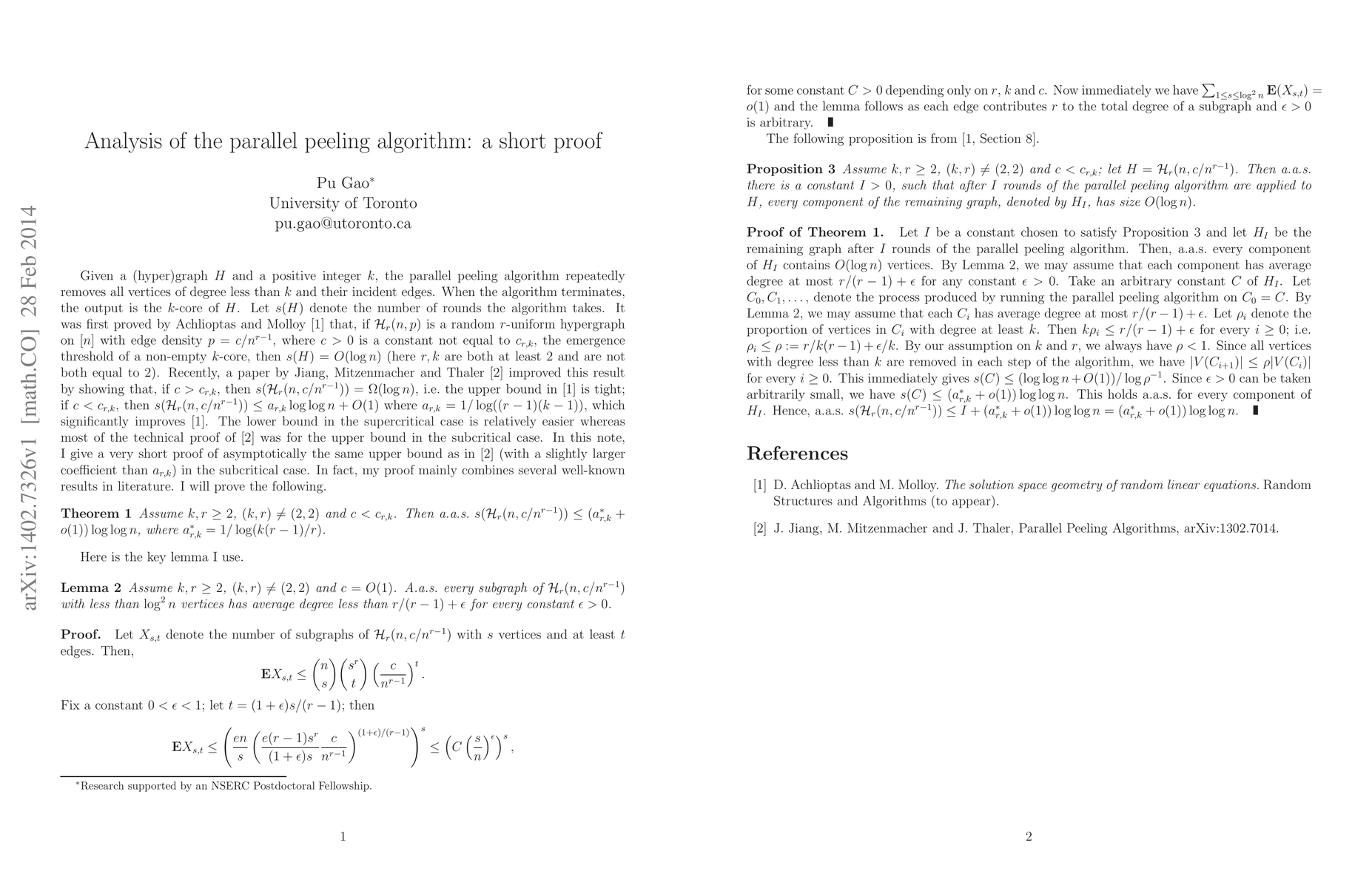 The research provides a short proof for the upper bound on the number of rounds needed in a parallel peeling algorithm applied to a random hypergraph with edge density below the k-core emergence threshold, building upon previous work by Achlioptas and Molloy and Jiang, Mitzenmacher, and Thaler.
